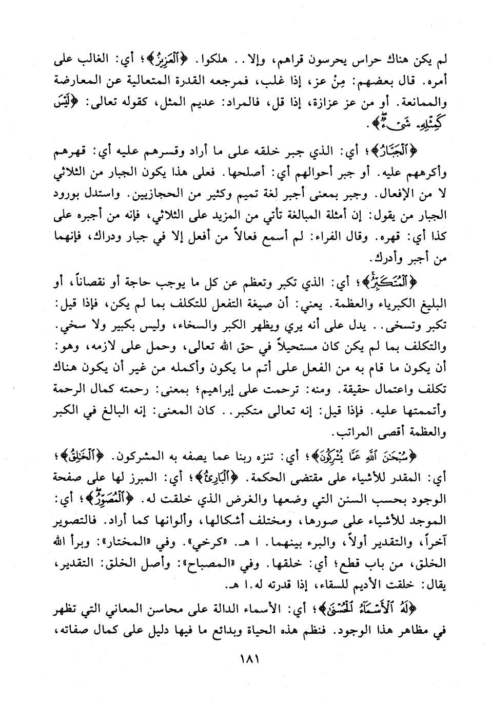 {الْجَبَّارُ}؛ أي: الذي جبر خلقه على ما أراد وقسرهم عليه أي: قهرهم وأكرههم عليه. أو جبر أحوالهم أي: أصلحها. فعلى هذا يكون الجبار من الثلاثي لا من الإفعال. وجبر بمعنى أجبر لغة تميم وكثير من الحجازيين. واستدل بورود الجبار من يقول: إن أمثلة المبالغة تأتي من المزيد على الثلاثي، فإنه من أجبره على كذا أي: قهره. وقال الفراء: لم أسمع فعالًا من أفعل إلا في جبار ودراك، فإنهما من أجبر وأدرك.