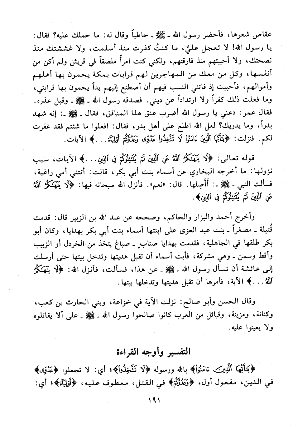 وأخرج أحمد والبزار والحاكم، وصححه عن عبد الله بن الزبير قال: قدمت قُتيلة - مصغرًا - بنت عبد العزى على ابنتها أسماء بنت أبي بكر بهدايا، وكان أبو بكر طلقها في الجاهلية، فقدمت بهدايا صنابٍ - صباغ يتخذ من الخردل أو الزبيب وأقط وسمن - وهي مشركة، فأبت أسماء أن تقبل هديتها وتدخل بيتها حتى أرسلت إلى عائشة أن تسأل رسول الله - صلى الله عليه وسلم - عن هذا، فسألت، فأنزل الله: {لَا يَنْهَاكُمُ اللَّهُ ...} الآية، فأمرها أن تقبل هديتها وتدخلها بيتها.