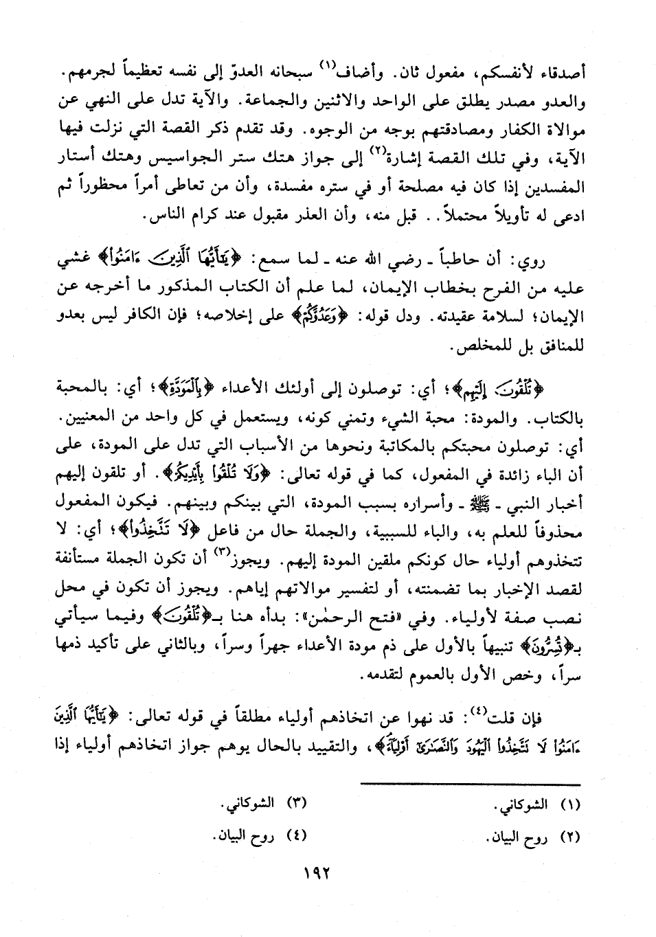 {تُلْقُونَ إِلَيْهِمْ}؛ أي: توصلون إلى أولئك الأعداء {بِالْمَوَدَّةِ}؛ أي: بالمحبة بالكتاب. والمودة: محبة الشيء وتمني كونه، ويستعمل في كل واحد من المعنيين. أي: توصلون محبتكم بالمكاتبة ونحوها من الأسباب التي تدل على المودة، على أن الباء زائدة في المفعول، كما في قوله تعالى: {وَلَا تُلْقُوا بِأَيْدِيكُمْ}. أو تلقون إليهم أخبار النبي - صلى الله عليه وسلم - وأسراره بسبب المودة، التي بينكم وبينهم. فيكون المفعول محذوفًا للعلم به، والباء للسببية، والجملة حال من فاعل {لَا تَتَّخِذُوا}؛ أي: لا تتخذوهم أولياء حال كونكم ملقين المودة إليهم. ويجوز (¬3) أن تكون الجملة مستأنفة لقصد الإخبار بما تضمنته، أو لتفسير موالاتهم إياهم. ويجوز أن تكون في محل نصب صفة لأولياء. وفي "فتح الرحمن": بدأه هنا بـ {تُلْقُونَ} وفيما سيأتي بـ {تُسِرُّونَ} تنبيهًا بالأول على ذم مودة الأعداء جهرًا وسرًا، وبالثاني على تأكيد ذمها سرًا، وخص الأول بالعموم لتقدمه.