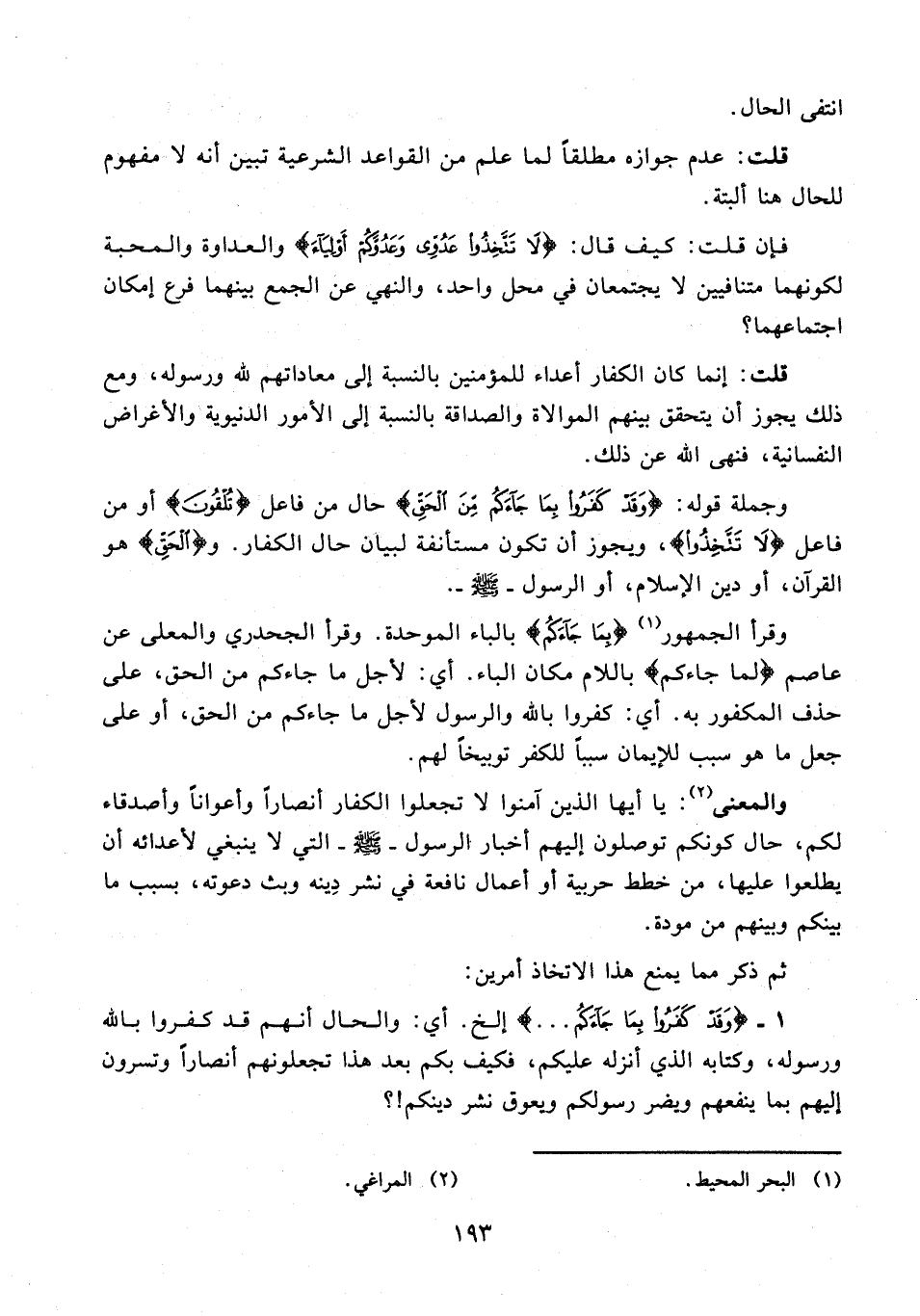 1 - {وَقَدْ كَفَرُوا بِمَا جَاءَكُمْ ...} إلخ. أي: والحال أنهم قد كفروا بالله ورسوله، وكتابه الذي أنزله عليكم، فكيف بكم بعد هذا تجعلونهم أنصارًا وتسرون إليهم بما ينفعهم ويضر رسولكم ويعوق نشر دينكم!؟