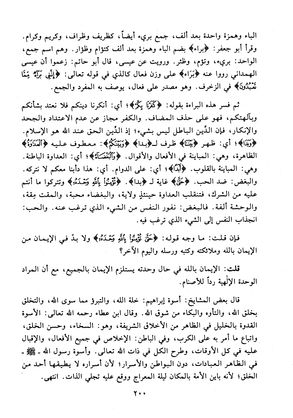 قال بعض المشايخ: أسوة إبراهيم: خلة الله، والتبرؤ مما سوى الله، والتخلق بخلق الله، والتأوه والبكاء من شوق الله. وقال ابن عطاء رحمه الله تعالى: الأسوة القدوة بالخليل في الظاهر من الأخلاق الشريفة، وهو: السخاء، وحسن الخلق، واتباع ما أمر به على الكرب، وفي الباطن: الإخلاص في جميع الأفعال، والإقبال عليه في كل الأوقات، وطرح الكل في ذات الله تعالى. وأسوة رسول الله - صلى الله عليه وسلم - في الظاهر العبادات، دون البواطن والأسرار؛ لأن أسراره لا يطيقها أحد من الخلق؛ لأنه باين الأمة بالمكان ليلة المعراج ووقع عليه تجلي الذات. انتهى.