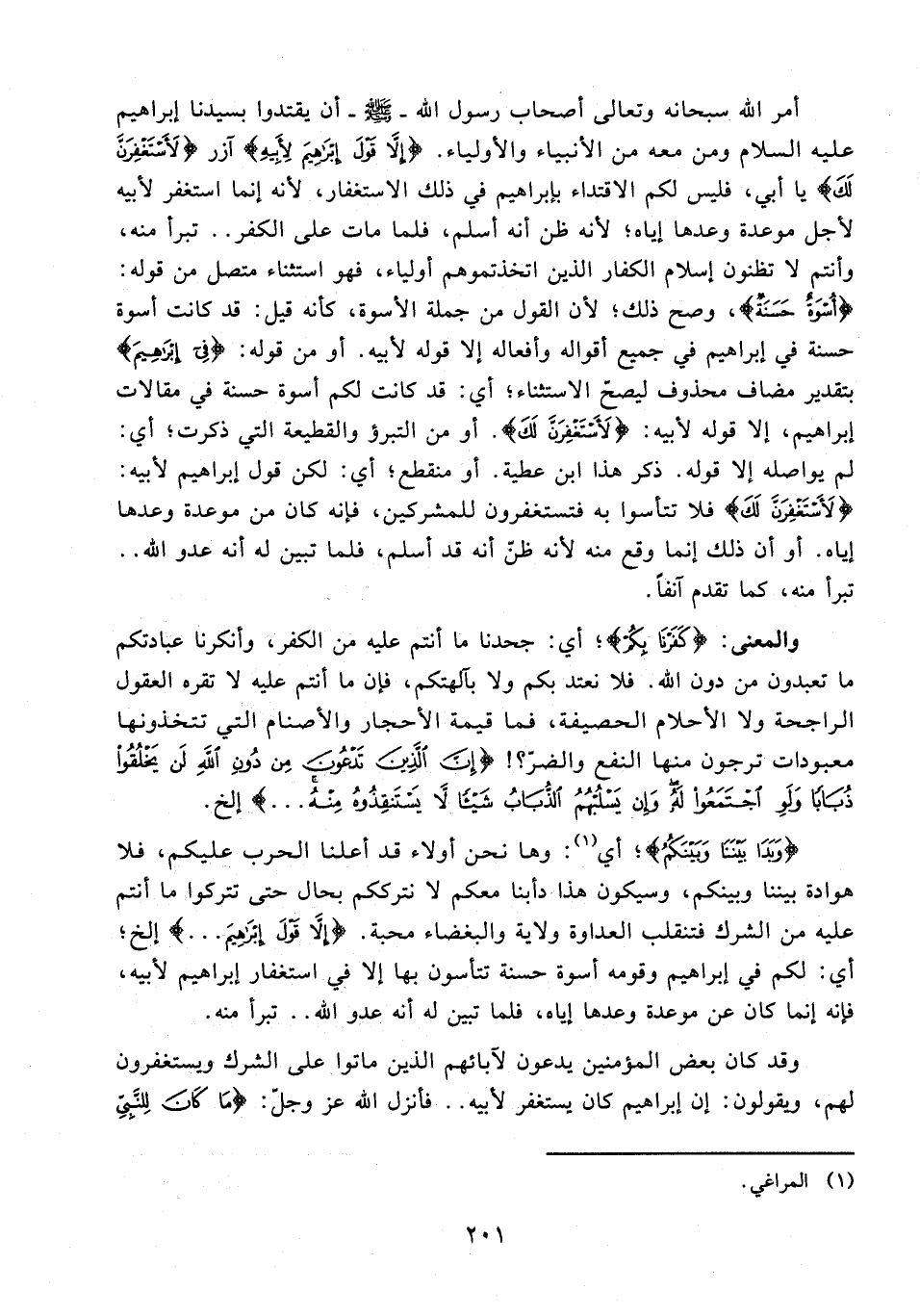 أمر الله سبحانه وتعالى أصحاب رسول الله - صلى الله عليه وسلم - أن يقتدوا بسيدنا إبراهيم عليه السلام ومن معه من الأنبياء والأولياء. {إِلَّا قَوْلَ إِبْرَاهِيمَ لِأَبِيهِ} آزر {لَأَسْتَغْفِرَنَّ لَكَ} يا أبي، فليس لكم الاقتداء بإبراهيم في ذلك الاستغفار؛ لأنه إنما استغفر لأبيه لأجل موعدة وعدها إياه؛ لأنه ظن أنه أسلم، فلما مات على الكفر .. تبرأ منه، وأنتم لا تظنون إسلام الكفار الذين اتخذتموهم أولياء، فهو استثناء متصل من قوله: {أُسْوَةٌ حَسَنَةٌ}، وصح ذلك؛ لأن القول من جملة الأسوة، كأنه قيل: قد كانت أسوة حسنة في إبراهيم في جميع أقواله وأفعاله إلا قوله لأبيه. أو من قوله: {فِي إِبْرَاهِيمَ} بتقدير مضاف محذوف ليصحّ الاستثناء؛ أي: قد كانت لكم أسوة حسنة في مقالات إبراهيم، إلا قوله لأبيه: {لَأَسْتَغْفِرَنَّ لَكَ}. أو من التبرؤ والقطيعة التي ذكرت؛ أي: لم يواصله إلا قوله. ذكر هذا ابن عطية. أو منقطع؛ أي: لكن قول إبراهيم لأبيه: {لَأَسْتَغْفِرَنَّ لَكَ} فلا تتأسوا به فتستغفرون للمشركين، فإنه كان من موعدة وعدها إياه. أو أن ذلك إنما وقع منه لأنه ظن أنه قد أسلم، فلما تبين له أنه عدو الله .. تبرأ منه، كما تقدم آنفًا.