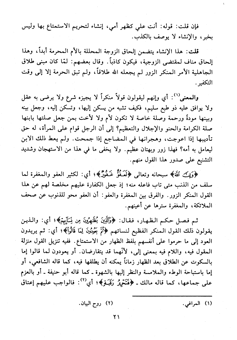 قلت: هذا الإنشاء يتضمن إلحاق الزوجة المحللة بالأم المحرمة أبدًا، وهذا إلحاق مناف لمقتضى الزوجية، فيكون كاذبًا. وقال بعضهم: لمّا كان مبنى طلاق الجاهلية الأمر المنكر الزور لم يجعله الله طلاقًا، ولم تبق الحرمة إلا إلى وقت التكفير.
