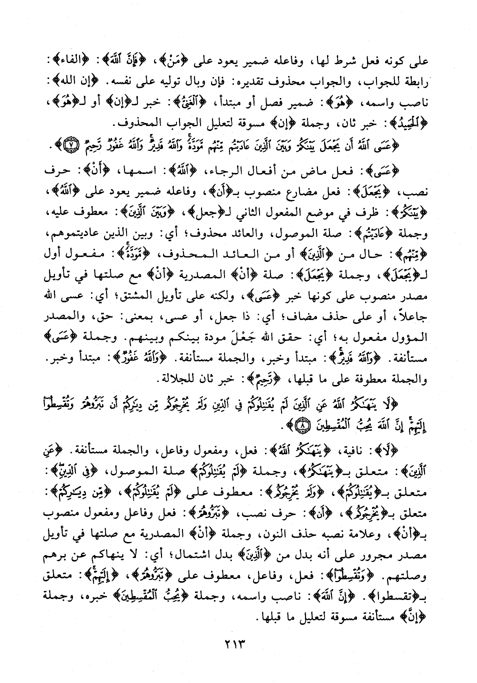 {لَا}: نافية، {يَنْهَاكُمُ اللَّهُ}: فعل، ومفعول وفاعل، والجملة مستأنفة. {عَنِ الَّذِينَ}: متعلق بـ {يَنْهَاكُمُ}، وجملة {لَمْ يُقَاتِلُوكُمْ} صلة الموصول، {فِي الدِّينِ}: متعلق بـ {يُقَاتِلُوكُمْ}، {وَلَمْ يُخْرِجُوكُمْ}: معطوف على {لَمْ يُقَاتِلُوكُمْ}، {مِنْ دِيَارِكُمْ}: متعلق بـ {يُخْرِجُوكُمْ}، {أَن}: حرف نصب، {تَبَرُّوهُمْ}: فعل وفاعل ومفعول منصوب بـ {أَنْ}، وعلامة نصبه حذف النون، وجملة {أَنْ} المصدرية مع صلتها في تأويل مصدر مجرور على أنه بدل من {الَّذِينَ} بدل اشتمال؛ أي: لا ينهاكم عن برهم وصلتهم. {وَتُقْسِطُوا}: فعل، وفاعل، معطوف على {تَبَرُّوهُمْ}، {إِلَيْهِمْ}: متعلق بـ {تقسطوا}. {إِنَّ اللَّهَ}: ناصب واسمه، وجملة {يُحِبُّ الْمُقْسِطِينَ} خبره، وجملة {إِنَّ} مستأنفة مسوقة لتعليل ما قبلها.