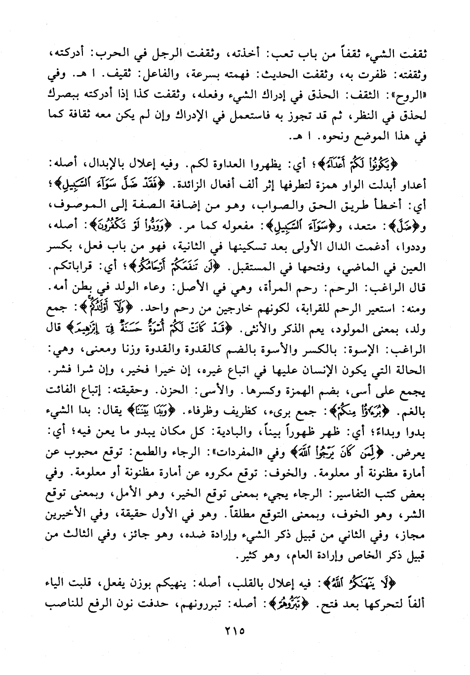 {يَكُونُوا لَكُمْ أَعْدَاءً}؛ أي: يظهروا العداوة لكم. وفيه إعلال بالإبدال، أصله: أعداو أبدلت الواو همزة لتطرفها إثر ألف أفعال الزائدة. {فَقَدْ ضَلَّ سَوَاءَ السَّبِيلِ}؛ أي: أخطأ طريق الحق والصواب، وهو من إضافة الصفة إلى الموصوف، و {ضَلَّ}: متعد، و {سَوَاءَ السَّبِيلِ}: مفعوله كما مر. {وَوَدُّوا لَوْ تَكْفُرُونَ}: أصله، وددوا، أدغمت الدال الأولى بعد تسكينها في الثانية، فهو من باب فعل، بكسر العين في الماضي، وفتحها في المستقبل. {لَنْ تَنْفَعَكُمْ أَرْحَامُكُمْ}؛ أي: قراباتكم. قال الراغب: الرحم: رحم المرأة، وهي في الأصل: وعاء الولد في بطن أمه. ومنه: استعير الرحم للقرابة، لكونهم خارجين من رحم واحد. {وَلَا أَوْلَادُكُمْ}: جمع ولد، بمعنى المولود، يعم الذكر والأنثى. {قَدْ كَانَتْ لَكُمْ أُسْوَةٌ حَسَنَةٌ فِي إِبْرَاهِيمَ} قال الراغب: الإسوة: بالكسر والأسوة بالضم كما لقدوة والقدوة وزنا ومعنى، وهي: الحالة التي يكون الإنسان عليها في اتباع غيره، إن خيرًا فخير، وإن شرا فشر. يجمع على أسى، بضم الهمزة وكسرها. والأسى: الحزن. وحقيقته: إتباع الفائت بالغم. {بُرَآءُ مِنْكُمْ}: جمع برىء، كظريف وظرفاء. {وَبَدَا بَيْنَنَا} يقال: بدا الشيء بدوا وبداءً؛ أي: ظهر ظهورًا بينًا، والبادية: كل مكان يبدو ما يعن فيه؛ أي: يعرض. {لِمَنْ كَانَ يَرْجُو اللَّهَ} وفي "المفردات": الرجاء والطمع: توقع محبوب عن أمارة مظنونة أو معلومة. والخوف: توقع مكروه عن أمارة مظنونة أو معلومة. وفي بعض كتب التفاسير: الرجاء يجيء بمعنى توقع الخير، وهو الأمل، وبمعنى توقع الشر، وهو الخوف، وبمعنى التوقع مطلقًا. وهو في الأول حقيقة، وفي الأخيرين مجاز، وفي الثاني من قبيل ذكر الشيء وإرادة ضده، وهو جائز، وفي الثالث من قبيل ذكر الخاص وإرادة العام، وهو كثير.