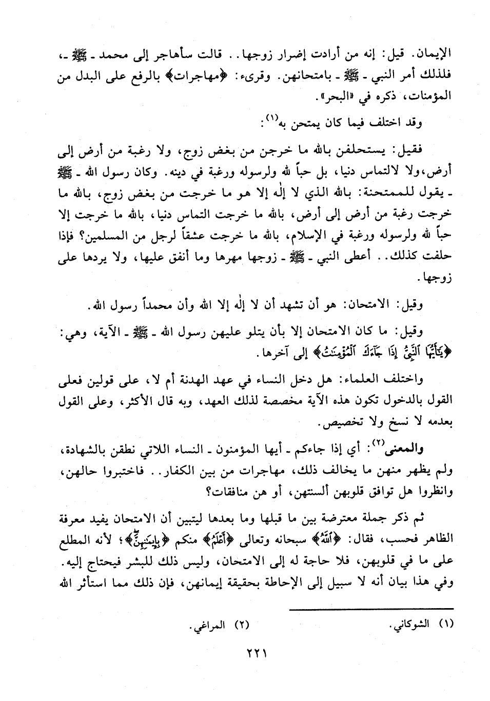 فقيل: يستحلفن بالله ما خرجن من بغض زوج، ولا رغبة من أرض إلى أرض، ولا لالتماس دنيا، بل حبًا لله ولرسوله ورغبة في دينه. وكان رسول الله - صلى الله عليه وسلم - يقول للممتحنة: بالله الذي لا إله إلا هو ما خرجت من بغض زوج، بالله ما خرجت رغبة من أرض إلى أرض، بالله ما خرجت التماس دنيا، بالله ما خرجت إلا حبًا لله ولرسوله ورغبة في الإِسلام، بالله ما خرجت عشقًا لرجل من المسلمين؟ فإذا حلفت كذلك .. أعطى النبي - صلى الله عليه وسلم - زوجها مهرها وما أنفق عليها، ولا يردها على زوجها.