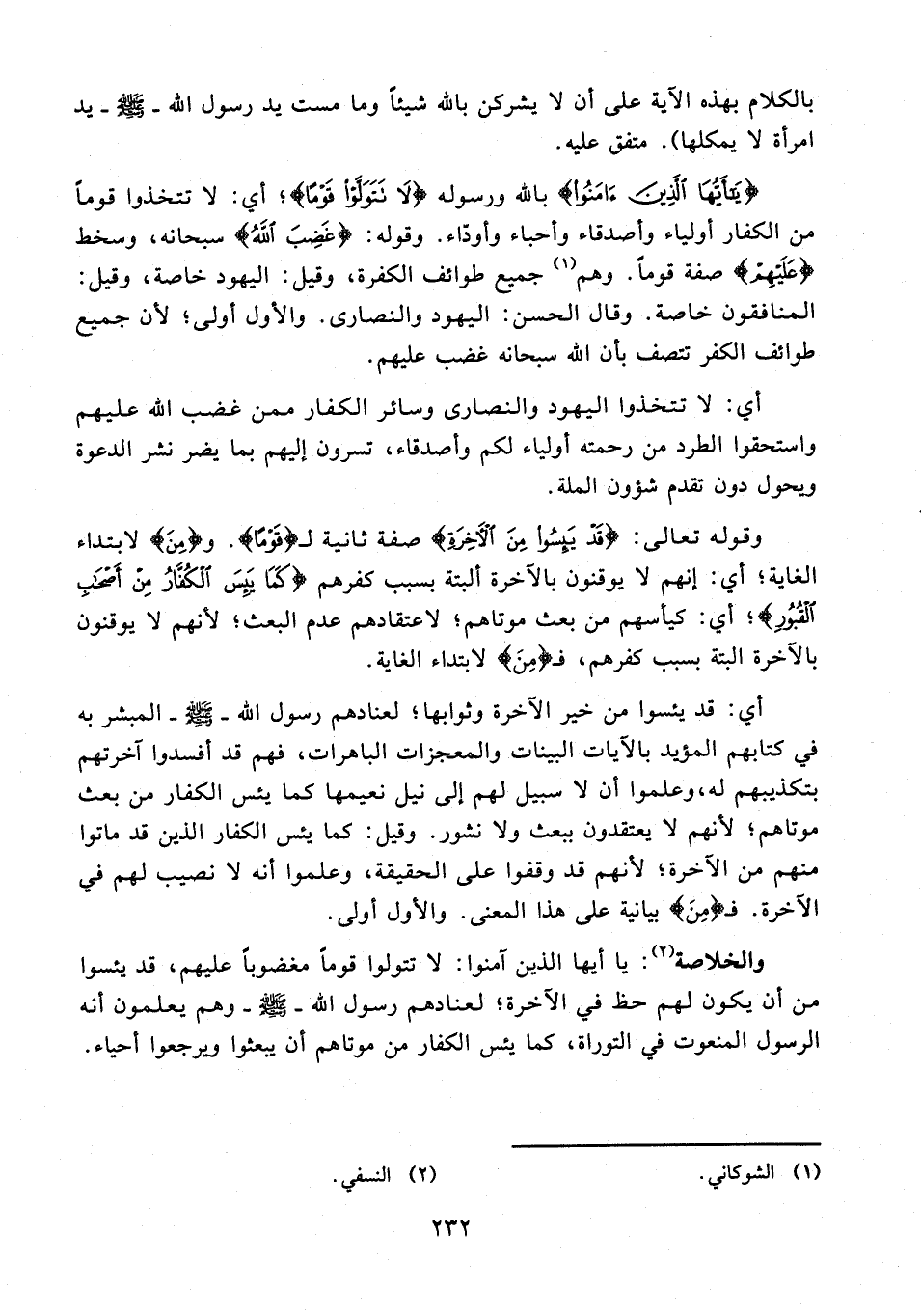 والخلاصة (¬2): يا أيها الذين آمنوا: لا تتولوا قومًا مغضوبًا عليهم، قد يئسوا من أن يكون لهم حظ في الآخرة؛ لعنادهم رسول الله - صلى الله عليه وسلم - وهم يعلمون أنه الرسول المنعوت في التوراة، كما فيض الكفار من موتاهم أن يبعثوا ويرجعوا أحياء.