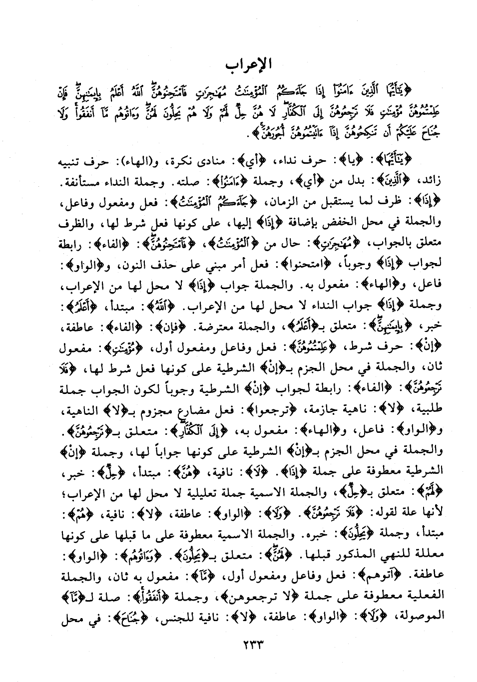 {يَا أَيُّهَا}: {يا}: حرف نداء، {أَيّ}: منادى نكرة، و {الهاء}: حرف تنبيه زائد، {الَّذِينَ}: بدل من {أي}، وجملة {آمَنُوا}: صلته. وجملة النداء مستأنفة. {إِذَا}: ظرف لما يستقبل من الزمان، {جَاءَكُمُ الْمُؤْمِنَاتُ}: فعل ومفعول وفاعل، والجملة في محل الخفض بإضافة {إِذَا} إليها، على كونها فعل شرط لها، والظرف متعلق بالجواب، {مُهَاجِرَاتٍ}: حال من {الْمُؤْمِنَاتُ}، {فَامْتَحِنُوهُنَّ}: {الفاء}: رابطة لجواب {إِذَا} وجوبًا، {امْتَحِنُوا}: فعل أمر مبني على حذف النون، و {الواو}: فاعل، و {الهاء}: مفعول به. والجملة جواب {إذا} لا محل لها من الإعراب، وجملة {إِذَا} جواب النداء لا محل لها من الإعراب. {اللهُ}: مبتدأ، {أَعْلَمُ}: خبر، {بِإِيمَانِهِنَّ}: متعلق بـ {أَعْلَمُ}، والجملة معترضة. {فإن}: {الفاء}: عاطفة، {إِنْ}: حرف شرط، {عَلِمْتُمُوهُنَّ}: فعل وفاعل ومفعول أول، {مُؤْمِنَاتٍ}: مفعول ثان، والجملة في محل الجزم بـ {إنْ} الشرطية على كونها فعل شرط لها، {فَلَا تَرْجِعُوهُنَّ}: {الفاء}: رابطة لجواب {إنْ} الشرطية وجوبًا لكون الجواب جملة طلبية، {لا}: ناهية جازمة، {ترجعوا}: فعل مضارع مجزوم بـ {لا} الناهية، و {الواو}: فاعل، و {الهاء}: مفعول به، {إِلَى الْكُفَّارِ}: متعلق بـ {تَرْجِعُوهُنَّ}. والجملة في محل الجزم بـ {إنْ} الشرطية على كونها جوابًا لها، وجملة {إنْ} الشرطية معطوفة على جملة {إذًا}. {لَا}: نافية، {هُنَّ}: مبتدأ، {حِلٌّ}: خبر، {لَهُمْ}: متعلق بـ {حِلٌّ}، والجملة الاسمية جملة تعليلية لا محل لها من الإعراب؛ لأنها علة لقوله: {فَلَا تَرْجِعُوهُنَّ}. {وَلَا}: {الواو}: عاطفة، {لا}: نافية، {هُمْ}: مبتدأ، وجملة {يَحِلُّونَ}: خبره. والجملة الاسمية معطوفة على ما قبلها على كونها معللة للنهي المذكور قبلها. {لَهُنَّ}: متعلق بـ {يَحِلُّونَ}. {وَآتُوهُمْ}: {الواو}: عاطفة. {آتُوهُمْ}: فعل وفاعل ومفعول أول، {مَا}: مفعول به ثان، والجملة الفعلية معطوفة على جملة {لا ترجعوهن}، وجملة {أَنْفَقُوا}: صلة لـ {مَا} الموصولة، {وَلَا}: {الواو}: عاطفة، {لا}: نافية للجنس، {جُنَاحَ}: في محل