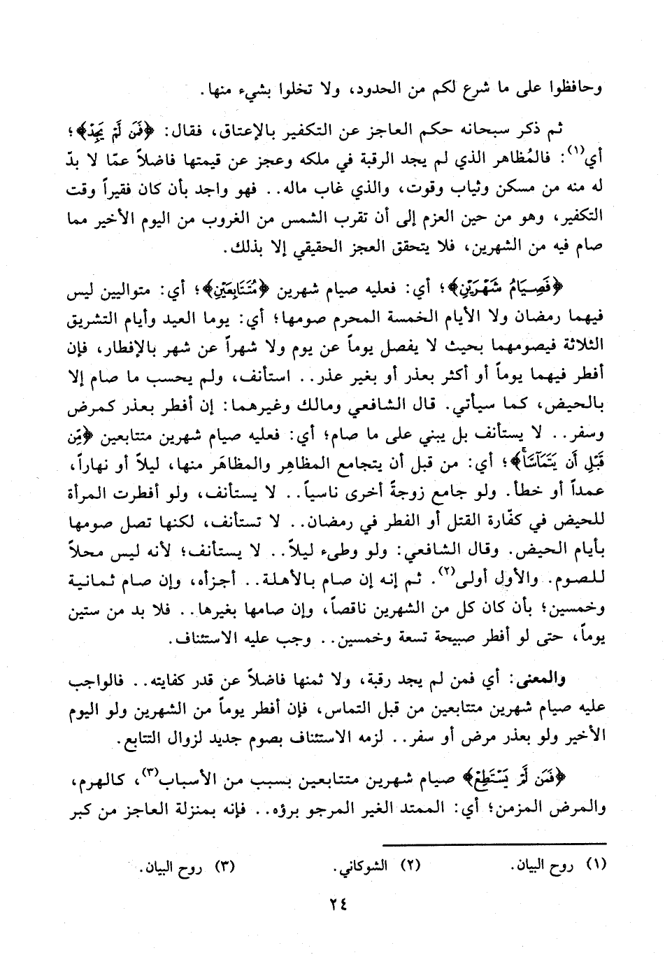 4 - ثم ذكر سبحانه حكم العاجز عن التكفير بالإعتاق، فقال: {فَمَنْ لَمْ يَجِدْ}؛ أي (¬1): فالمُظاهر الذي لم يجد الرقبة في ملكه وعجز عن قيمتها فاضلًا عمّا لا بدّ له منه من مسكن وثياب وقوت، والذي غاب ماله .. فهو واجد بأن كان فقيرًا وقت التكفير، وهو من حين العزم إلى أن تقرب الشمس من الغروب من اليوم الأخير مما صام فيه من الشهرين، فلا يتحقق العجز الحقيقي إلا بذلك.