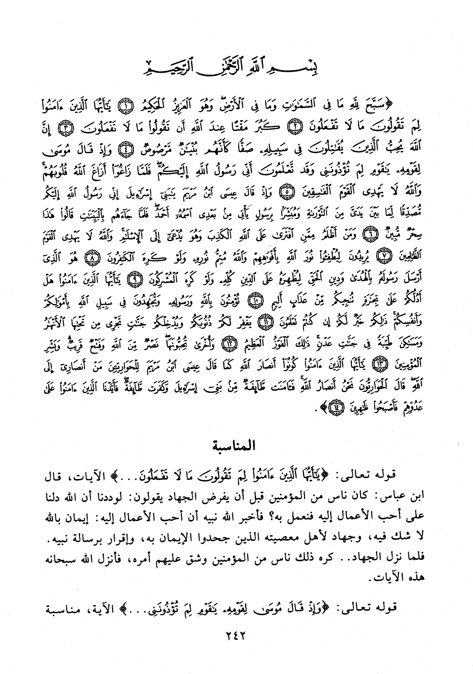 {سَبَّحَ لِلَّهِ مَا فِي السَّمَاوَاتِ وَمَا فِي الْأَرْضِ وَهُوَ الْعَزِيزُ الْحَكِيمُ (1) يَا أَيُّهَا الَّذِينَ آمَنُوا لِمَ تَقُولُونَ مَا لَا تَفْعَلُونَ (2) كَبُرَ مَقْتًا عِنْدَ اللَّهِ أَنْ تَقُولُوا مَا لَا تَفْعَلُونَ (3) إِنَّ اللَّهَ يُحِبُّ الَّذِينَ يُقَاتِلُونَ فِي سَبِيلِهِ صَفًّا كَأَنَّهُمْ بُنْيَانٌ مَرْصُوصٌ (4) وَإِذْ قَالَ مُوسَى لِقَوْمِهِ يَا قَوْمِ لِمَ تُؤْذُونَنِي وَقَدْ تَعْلَمُونَ أَنِّي رَسُولُ اللَّهِ إِلَيْكُمْ فَلَمَّا زَاغُوا أَزَاغَ اللَّهُ قُلُوبَهُمْ وَاللَّهُ لَا يَهْدِي الْقَوْمَ الْفَاسِقِينَ (5) وَإِذْ قَالَ عِيسَى ابْنُ مَرْيَمَ يَا بَنِي إِسْرَائِيلَ إِنِّي رَسُولُ اللَّهِ إِلَيْكُمْ مُصَدِّقًا لِمَا بَيْنَ يَدَيَّ مِنَ التَّوْرَاةِ وَمُبَشِّرًا بِرَسُولٍ يَأْتِي مِنْ بَعْدِي اسْمُهُ أَحْمَدُ فَلَمَّا جَاءَهُمْ بِالْبَيِّنَاتِ قَالُوا هَذَا سِحْرٌ مُبِينٌ (6) وَمَنْ أَظْلَمُ مِمَّنِ افْتَرَى عَلَى اللَّهِ الْكَذِبَ وَهُوَ يُدْعَى إِلَى الْإِسْلَامِ وَاللَّهُ لَا يَهْدِي الْقَوْمَ الظَّالِمِينَ (7) يُرِيدُونَ لِيُطْفِئُوا نُورَ اللَّهِ بِأَفْوَاهِهِمْ وَاللَّهُ مُتِمُّ نُورِهِ وَلَوْ كَرِهَ الْكَافِرُونَ (8) هُوَ الَّذِي أَرْسَلَ رَسُولَهُ بِالْهُدَى وَدِينِ الْحَقِّ لِيُظْهِرَهُ عَلَى الدِّينِ كُلِّهِ وَلَوْ كَرِهَ الْمُشْرِكُونَ (9) يَا أَيُّهَا الَّذِينَ آمَنُوا هَلْ أَدُلُّكُمْ عَلَى تِجَارَةٍ تُنْجِيكُمْ مِنْ عَذَابٍ أَلِيمٍ (10) تُؤْمِنُونَ بِاللَّهِ وَرَسُولِهِ وَتُجَاهِدُونَ فِي سَبِيلِ اللَّهِ بِأَمْوَالِكُمْ وَأَنْفُسِكُمْ ذَلِكُمْ خَيْرٌ لَكُمْ إِنْ كُنْتُمْ تَعْلَمُونَ (11) يَغْفِرْ لَكُمْ ذُنُوبَكُمْ وَيُدْخِلْكُمْ جَنَّاتٍ تَجْرِي مِنْ تَحْتِهَا الْأَنْهَارُ وَمَسَاكِنَ طَيِّبَةً فِي جَنَّاتِ عَدْنٍ ذَلِكَ الْفَوْزُ الْعَظِيمُ (12) وَأُخْرَى تُحِبُّونَهَا نَصْرٌ مِنَ اللَّهِ وَفَتْحٌ قَرِيبٌ وَبَشِّرِ الْمُؤْمِنِينَ (13) يَا أَيُّهَا الَّذِينَ آمَنُوا كُونُوا أَنْصَارَ اللَّهِ كَمَا قَالَ عِيسَى ابْنُ مَرْيَمَ لِلْحَوَارِيِّينَ مَنْ أَنْصَارِي إِلَى اللَّهِ قَالَ الْحَوَارِيُّونَ نَحْنُ أَنْصَارُ اللَّهِ فَآمَنَتْ طَائِفَةٌ مِنْ بَنِي إِسْرَائِيلَ وَكَفَرَتْ طَائِفَةٌ فَأَيَّدْنَا الَّذِينَ آمَنُوا عَلَى عَدُوِّهِمْ فَأَصْبَحُوا ظَاهِرِينَ (14)}.