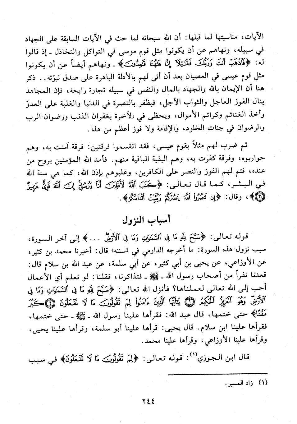 قوله تعالى: {سَبَّحَ لِلَّهِ مَا فِي السَّمَاوَاتِ وَمَا فِي الْأَرْضِ ...} إلى آخر السورة، سبب نزول هذه السورة: ما أخرجه الدارمي في "سننه" قال: أخبرنا محمد بن كثير، عن الأوزاعي، عن يحيى بن أبي كثير، عن أبي سلمة، عن عبد الله بن سلام قال: قعدنا نفرًا من أصحاب رسول الله - صلى الله عليه وسلم - فتذاكرنا، فقلنا: لو نعلم أي الأعمال أحب إلى الله تعالى لعملناها؟ فأنزل الله تعالى: {سَبَّحَ لِلَّهِ مَا فِي السَّمَاوَاتِ وَمَا فِي الْأَرْضِ وَهُوَ الْعَزِيزُ الْحَكِيمُ (1) يَا أَيُّهَا الَّذِينَ آمَنُوا لِمَ تَقُولُونَ مَا لَا تَفْعَلُونَ (2) كَبُرَ مَقْتًا} حتى ختمها، قال عبد الله: فقرأها علينا رسول الله - صلى الله عليه وسلم - حتى ختمها، فقرأها علينا ابن سلام. قال يحيى: قرأها علينا أبو سلمة، وقرأها علينا يحيى، وقرأها علينا الأوزاعي، وقرأها علينا محمد.