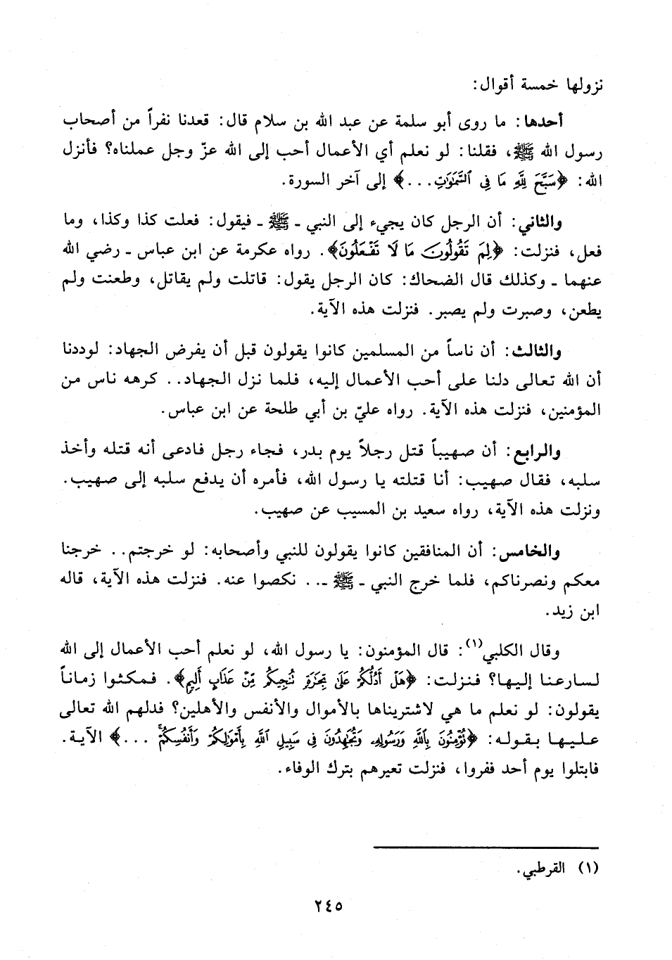 والثاني: أن الرجل كان يجيء إلى النبي - صلى الله عليه وسلم - فيقول: فعلت كذا وكذا، وما فعل، فنزلت: {لِمَ تَقُولُونَ مَا لَا تَفْعَلُونَ}. رواه عكرمة عن ابن عباس - رضي الله عنهما - وكذلك قال الضحاك: كان الرجل يقول: قاتلت ولم يقاتل، وطعنت ولم يطعن، وصبرت ولم يصبر. فنزلت هذه الآية.