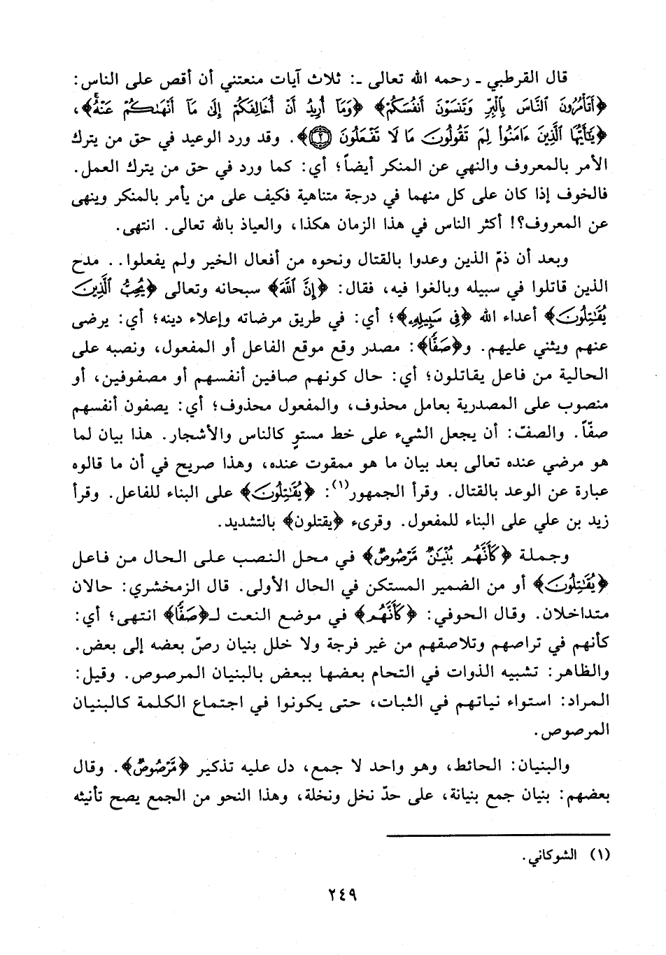 4 - وبعد أن ذمّ الذين وعدوا بالقتال ونحوه من أفعال الخير ولم يفعلوا .. مدح الذين قاتلوا في سبيله وبالغوا فيه، فقال: {إِنَّ اللَّهَ} سبحانه وتعالى {يُحِبُّ الَّذِينَ يُقَاتِلُونَ} أعداء الله {فِي سَبِيلِهِ}؛ أي: في طريق مرضاته وإعلاء دينه؛ أي: يرضى عنهم ويثني عليهم. و {صَفًّا}: مصدر وقع موقع الفاعل أو المفعول، ونصبه على الحالية من فاعل يقاتلون؛ أي: حال كونهم صافين أنفسهم أو مصفوفين، أو منصوب على المصدرية بعامل محذوف، والمفعول محذوف؛ أي: يصفون أنفسهم صفًا. والصفّ: أن يجعل الشيء على خط مستوٍ كالناس والأشجار. هذا بيان لما هو مرضي عنده تعالى بعد بيان ما هو ممقوت عنده، وهذا صريح في أن ما قالوه عبارة عن الوعد بالقتال. وقرأ الجمهور (¬1): {يُقَاتِلُونَ} على البناء للفاعل. وقرأ زيد بن علي على البناء للمفعول. وقرىء {يقتلون} بالتشديد.