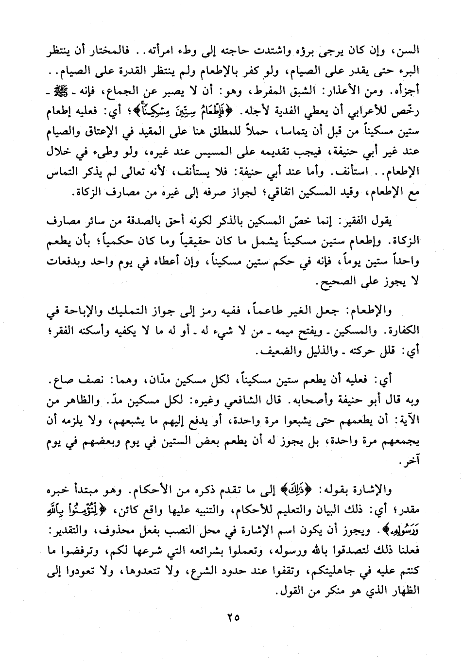 السن، وإن كان يرجى برؤه واشتدت حاجته إلى وطء امرأته .. فالمختار أن ينتظر البرء حتى يقدر على الصيام، ولو كفر بالإطعام ولم ينتظر القدرة على الصيام .. أجزأه. ومن الأعذار: الشبق المفرط، وهو: أن لا يصبر عن الجماع، فإنه - صلى الله عليه وسلم - رخّص للأعرابي أن يعطي الفدية لأجله. {فَإِطْعَامُ سِتِّينَ مِسْكِينًا}؛ أي: فعليه إطعام ستين مسكينًا من قبل أن يتماسا، حملًا للمطلق هنا على المقيد في الإعتاق والصيام عند غير أبي حنيفة، فيجب تقديمه على المسيس عند غيره، ولو وطىء في خلال الإطعام .. استأنف. وأما عند أبي حنيفة: فلا يستأنف؛ لأنه تعالى لم يذكر التماس مع الإطعام، وقيد المسكين اتفاقي؛ لجواز صرفه إلى غيره من مصارف الزكاة.