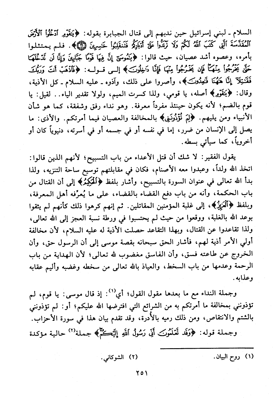 السلام - لبني إسرائيل حين ندبهم إلى قتال الجبابرة بقوله: {يَا قَوْمِ ادْخُلُوا الْأَرْضَ الْمُقَدَّسَةَ الَّتِي كَتَبَ اللَّهُ لَكُمْ وَلَا تَرْتَدُّوا عَلَى أَدْبَارِكُمْ فَتَنْقَلِبُوا خَاسِرِينَ (21)}. فلم يمتثلوا بأمره، وعصوه أشد عصيان، حيث قالوا: {يَا مُوسَى إِنَّ فِيهَا قَوْمًا جَبَّارِينَ وَإِنَّا لَنْ نَدْخُلَهَا حَتَّى يَخْرُجُوا مِنْهَا فَإِنْ يَخْرُجُوا مِنْهَا فَإِنَّا دَاخِلُونَ} إلى قوله: {فَاذْهَبْ أَنْتَ وَرَبُّكَ فَقَاتِلَا إِنَّا هَاهُنَا قَاعِدُونَ}، وأصروا على ذلك، وآذوه - عليه السلام - كل الأذية، وقال: {يَا قَوْمِ} أصله، يا قومي، ولذا كسرت الميم، ولولا تقدير الياء .. لقيل: يا قوم بالضم؛ لأنه يكون حينئذ مفردًا معرفة. وهو نداء رفق وشفقة، كما هو شأن الأنبياء ومن يليهم. {لِمَ تُؤْذُونَنِي} بالمخالفة والعصيان فيما أمرتكم. والأذى: ما يصل إلى الإنسان من ضرر، إما في نفسه أو في جسمه أو في أسرته، دنيويًا كان أو أخرويًا، كما سيأتي بسطه.