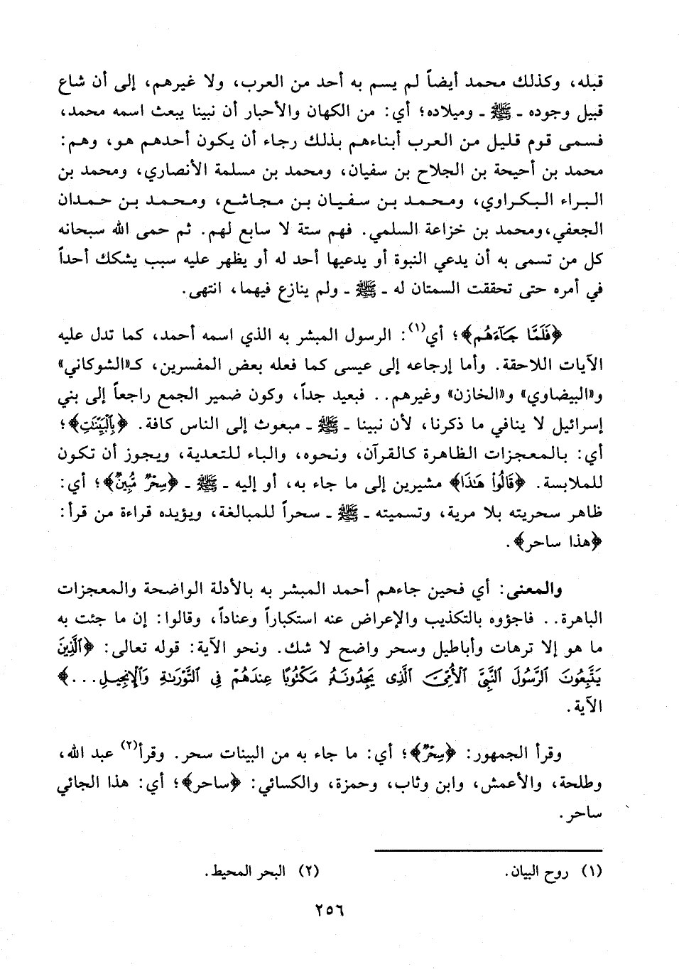 والمعنى: أي فحين جاءهم أحمد المبشر به بالأدلة الواضحة والمعجزات الباهرة .. فاجؤوه بالتكذيب والإعراض عنه استكبارًا وعنادًا، وقالوا: إن ما جئت به ما هو إلا ترهات وأباطيل وسحر واضح لا شك. ونحو الآية: قوله تعالى: {الَّذِينَ يَتَّبِعُونَ الرَّسُولَ النَّبِيَّ الْأُمِّيَّ الَّذِي يَجِدُونَهُ مَكْتُوبًا عِنْدَهُمْ فِي التَّوْرَاةِ وَالْإِنْجِيلِ ...} الآية.