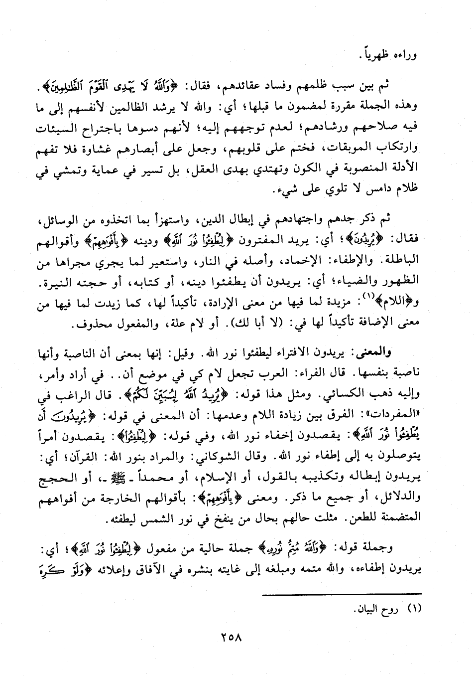 والمعنى: يريدون الافتراء ليطفئوا نور الله. وقيل: إنها بمعنى أن الناصبة وأنها ناصبة بنفسها. قال الفراء: العرب تجعل لام كي في موضع أن .. في أراد وأمر، وإليه ذهب الكسائي. ومثل هذا قوله: {يُرِيدُ اللَّهُ لِيُبَيِّنَ لَكُمْ}. قال الراغب في "المفردات": الفرق بين زيادة اللام وعدمها: أن المعنى في قوله: {يُرِيدُونَ أَنْ يُطْفِئُوا نُورَ اللَّهِ}: يقصدون إخفاء نور الله، وفي قوله: {لِيُطْفِئُوا}: يقصدون أمرًا يتوصلون به إلى إطفاء نور الله. وقال الشوكاني: والمراد بنور الله: القرآن؛ أي: يريدون إبطاله وتكذيبه بالقول، أو الإِسلام، أو محمدًا - صلى الله عليه وسلم -، أو الحجج والدلائل، أو جميع ما ذكر. ومعنى {بِأَفْوَاهِهِمْ}: بأقوالهم الخارجة من أفواههم المتضمنة للطعن. مثلت حالهم بحال من ينفخ في نور الشمس ليطفئه.
