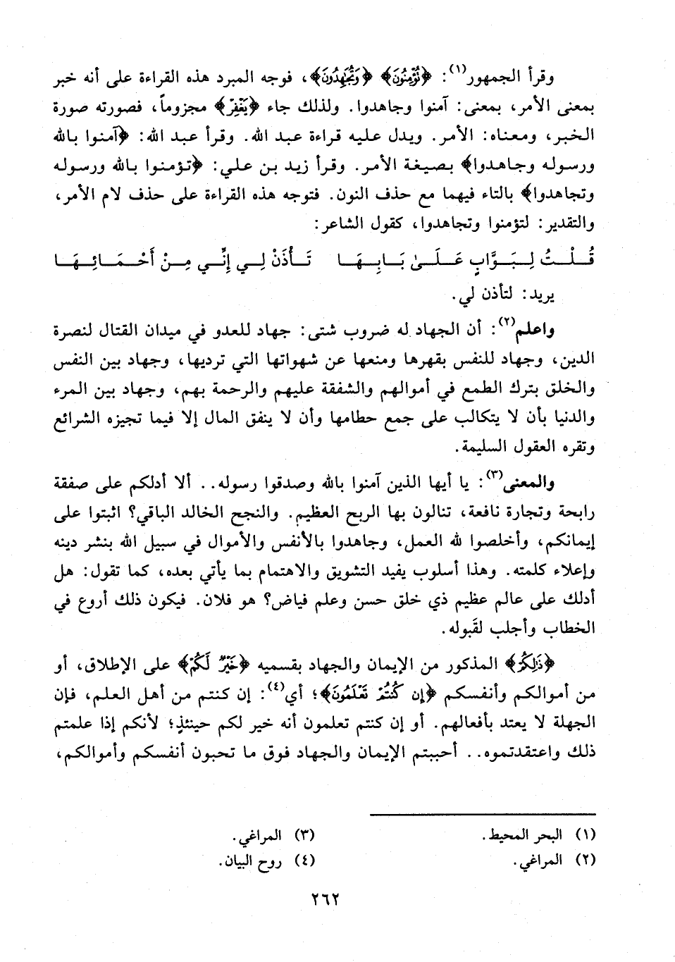 وقرأ الجمهور (¬1): {تُؤْمِنُونَ} {وَتُجَاهِدُونَ}، فوجه المبرد هذه القراءة على أنه خبر بمعنى الأمر، بمعنى: آمنوا وجاهدوا. ولذلك جاء {يَغْفِرْ} مجزومًا، فصورته صورة الخبر، ومعناه: الأمر. ويدل عليه قراءة عبد الله. وقرأ عبد الله: {آمَنُوا بِاللَّهِ وَرَسُولِهِ وَجَاهِدُوا} بصيغة الأمر. وقرأ زيد بن علي: {تؤمنوا بالله ورسوله وتجاهدوا} بالتاء فيهما مع حذف النون. فتوجه هذه القراءة على حذف لام الأمر، والتقدير: لتؤمنوا وتجاهدوا، كقول الشاعر: