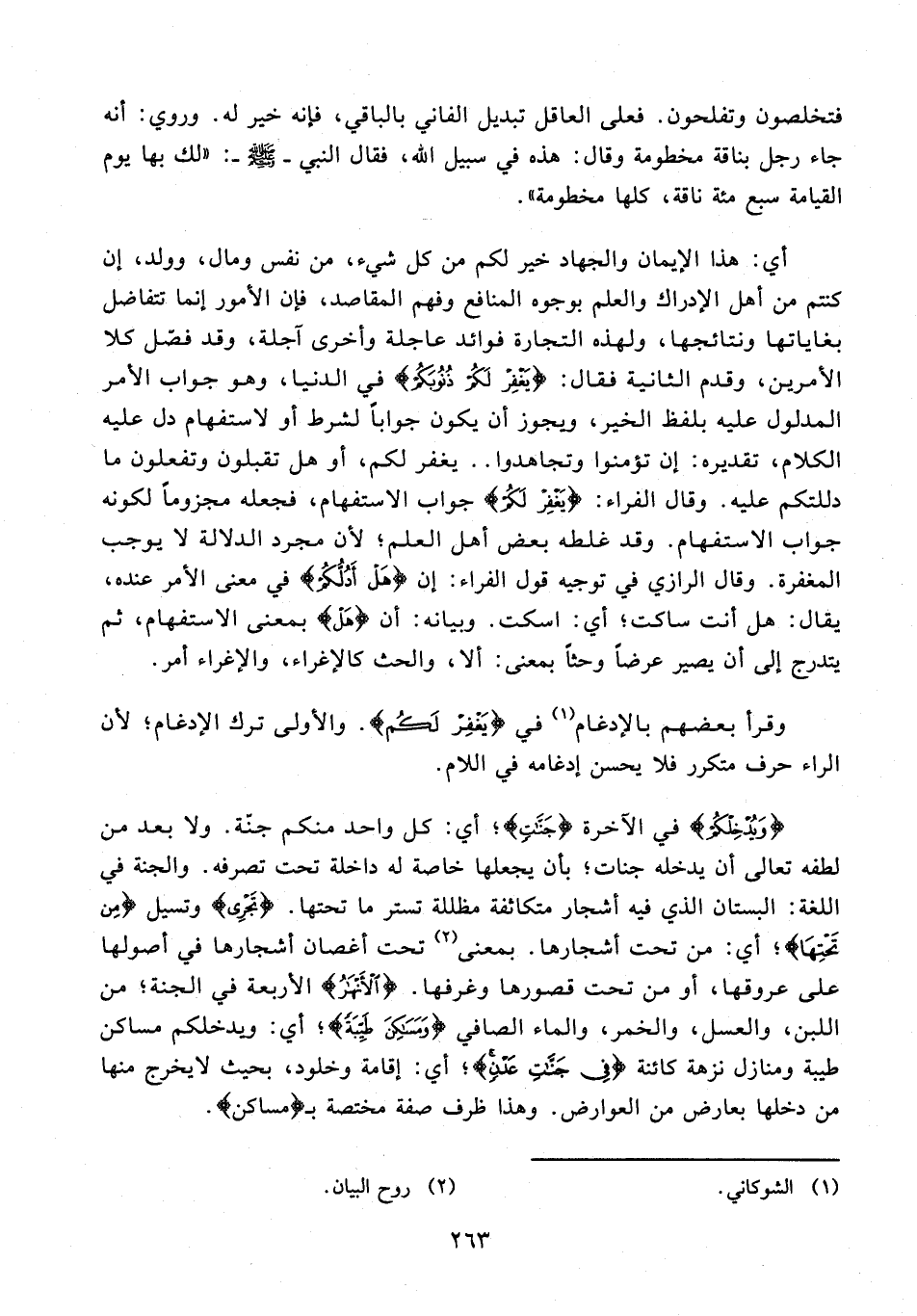 12 - ولهذه التجارة فوائد عاجلة وأخرى آجلة، وقد فصّل كلا الأمرين، وقدم الثانية فقال: {يَغْفِرْ لَكُمْ ذُنُوبَكُمْ} في الدنيا، وهو جواب الأمر المدلول عليه بلفظ الخير، ويجوز أن يكون جوابًا لشرط أو لاستفهام دل عليه الكلام، تقديره: إن تؤمنوا وتجاهدوا .. يغفر لكم، أو هل تقبلون وتفعلون ما دللتكم عليه. وقال الفراء: {يَغْفِرْ لَكُمْ} جواب الاستفهام، فجعله مجزومًا لكونه جواب الاستفهام. وقد غلطه بعض أهل العلم؛ لأن مجرد الدلالة لا يوجب المغفرة. وقال الرازي في توجيه قول الفراء: إن {هَلْ أَدُلُّكُمْ} في معنى الأمر عنده، يقال: هل أنت ساكت؛ أي: اسكت. وبيانه: أن {هَلْ} بمعنى الاستفهام، ثم يتدرج إلى أن يصير عرضًا وحثًا بمعنى: ألا، والحث كالإغراء، والإغراء أمر.