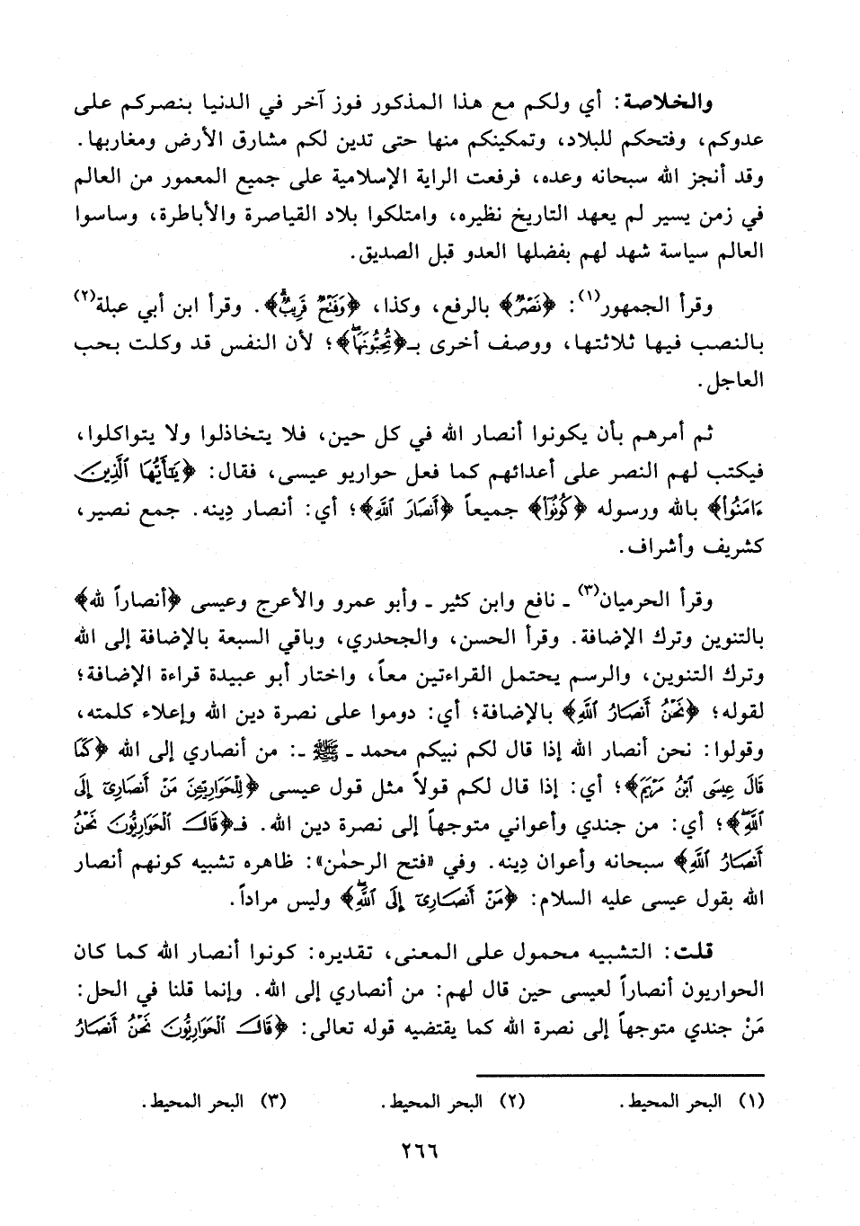 وقرأ الحرميان (¬3) - نافع وابن كثير - وأبو عمرو والأعرج وعيسى {أنصارًا لله} بالتنوين وترك الإضافة. وقرأ الحسن، والجحدري، وباقي السبعة بالإضافة إلى الله وترك التنوين، والرسم يحتمل القراءتين معًا، واختار أبو عبيدة قراءة الإضافة؛ لقوله: {نَحْنُ أَنْصَارُ اللَّهِ} بالإضافة؛ أي: دوموا على نصرة دين الله وإعلاء كلمته، وقولوا: نحن أنصار الله إذا قال لكم نبيكم محمد - صلى الله عليه وسلم -: من أنصاري إلى الله {كَمَا قَالَ عِيسَى ابْنُ مَرْيَمَ}؛ أي: إذا قال لكم قولًا مثل قول عيسى {لِلْحَوَارِيِّينَ مَنْ أَنْصَارِي إِلَى اللَّهِ}؛ أي: من جندي وأعواني متوجهًا إلى نصرة دين الله. فـ {اللَّهِ قَالَ الْحَوَارِيُّونَ نَحْنُ أَنْصَارُ اللَّهِ} سبحانه وأعوان دِينه. وفي "فتح الرحمن": ظاهره تشبيه كونهم أنصار الله بقول عيسى عليه السلام: {مَنْ أَنْصَارِي إِلَى اللَّهِ} وليس مرادًا.