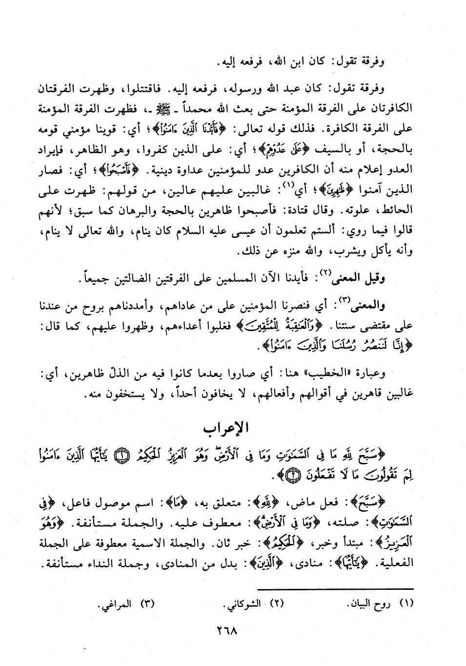 وفرقة تقول: كان عبد الله ورسوله، فرفعه إليه. فاقتتلوا، وظهرت الفرقتان الكافرتان على الفرقة المؤمنة حتى بعث الله محمدًا - صلى الله عليه وسلم -، فظهرت الفرقة المؤمنة على الفرقة الكافرة. فذلك قوله تعالى: {فَأَيَّدْنَا الَّذِينَ آمَنُوا}؛ أي: قوينا مؤمني قومه بالحجة، أو بالسيف {عَلَى عَدُوِّهِمْ}؛ أي: على الذين كفروا، وهو الظاهر، فإيراد العدو إعلام منه أن الكافرين عدو للمؤمنين عداوة دينية. {فَأَصْبَحُوا}؛ أي: فصار الذين آمنوا {ظَاهِرِينَ}؛ أي (¬1): غالبين عليهم عالين، من قولهم: ظهرت على الحائط، علوته. وقال قتادة: فأصبحوا ظاهرين بالحجة والبرهان كما سبق؛ لأنهم قالوا فيما روي: ألستم تعلمون أن عيسى عليه السلام كان ينام، والله تعالى لا ينام، وأنه يأكل ويشرب، والله منزه عن ذلك.