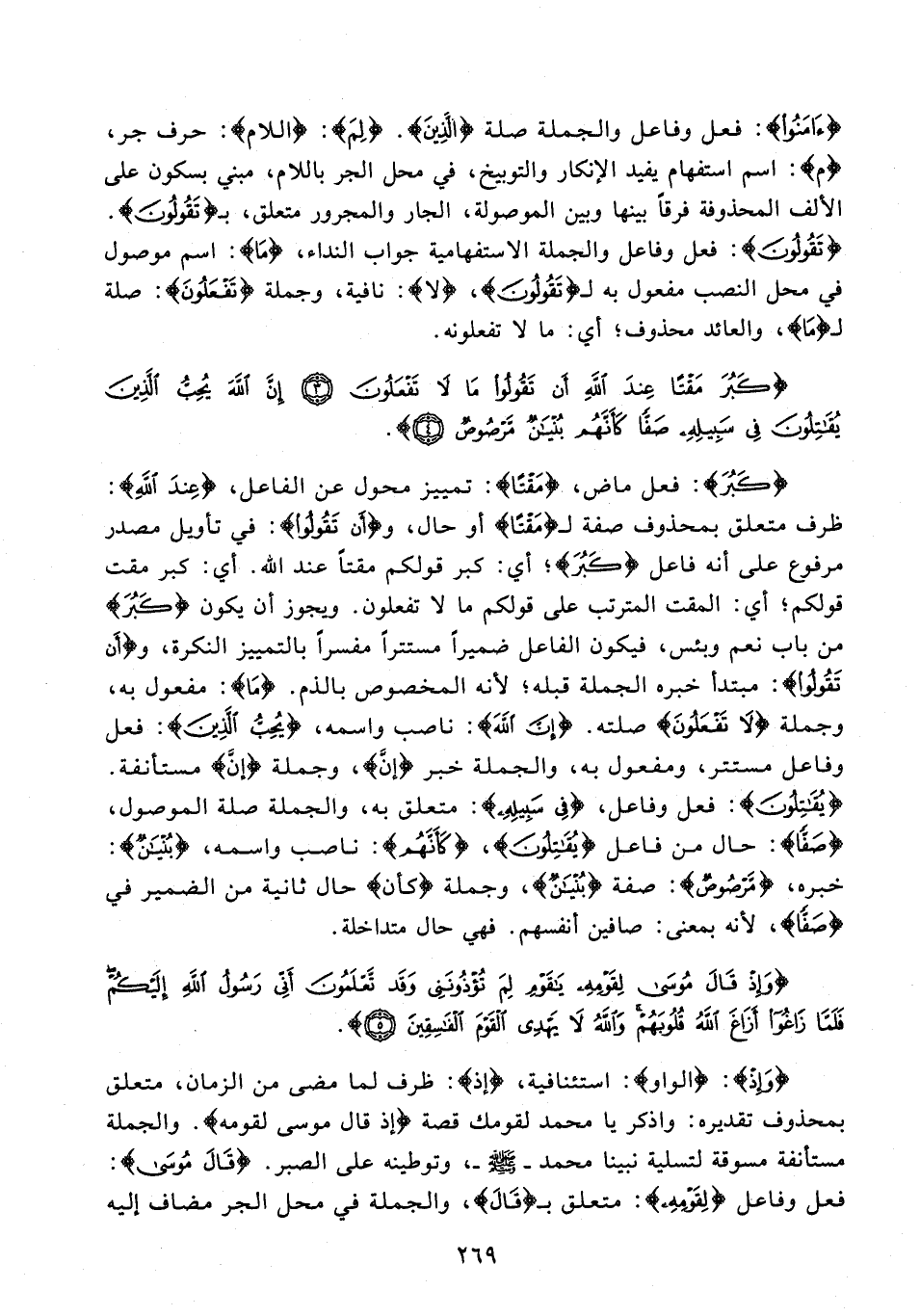 {كَبُرَ}: فعل ماض، {مَقْتًا}: تمييز محول عن الفاعل، {عِنْدَ اللَّهِ}: ظرف متعلق بمحذوف صفة لـ {مَقْتًا} أو حال، و {أَنْ تَقُولُوا}: في تأويل مصدر مرفوع على أنه فاعل {كَبُرَ}؛ أي: كبر قولكم مقتًا عند الله. أي: كبر مقت قولكم؛ أي: المقت المترتب على قولكم ما لا تفعلون. ويجوز أن يكون {كَبُرَ} من باب نعم وبئس، فيكون الفاعل ضميرًا مستترًا مفسرًا بالتمييز النكرة، و {أَنْ تَقُولُوا}: مبتدأ خبره الجملة قبله؛ لأنه المخصوص بالذم. {مَا}: مفعول به، وجملة {لَا تَفْعَلُونَ} صلته. {إِنَّ اللَّهَ}: ناصب واسمه، {يُحِبُّ الَّذِينَ}: فعل وفاعل مستتر، ومفعول به، والجملة خبر {إنَّ}، وجملة {إنَّ} مستأنفة. {يُقَاتِلُونَ}: فعل وفاعل، {فِي سَبِيلِهِ}: متعلق به، والجملة صلة الموصول، {صَفًّا}: حال من فاعل {يُقَاتِلُونَ}، {كَأَنَّهُمْ}: ناصب واسمه، {بُنْيَانٌ}: خبره، {مَرْصُوصٌ}: صفة {بُنْيَانٌ}، وجملة {كأن} حال ثانية من الضمير في {صَفًّا}؛ لأنه بمعنى: صافين أنفسهم. فهي حال متداخلة.