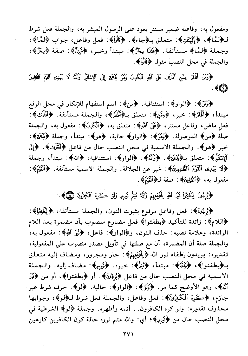 {وَمَنْ}: {الواو}: استئنافية. {من}: اسم استفهام للإنكار في محل الرفع مبتدأ، {أَظْلَمُ}: خبر، {مِمَّنِ}: متعلق بـ {أَظْلَمُ}، والجملة مستأنفة. {افْتَرَى}: فعل ماض، وفاعل مستتر، {عَلَى اللَّهِ}: متعلق به، {الْكَذِبَ}: مفعول به، والجملة صلة {من} الموصولة. {وَهُوَ}: {الواو} حالية، {هو}: مبتدأ، وجملة {يُدْعَى}: خبر {هو}. والجملة الاسمية في محل النصب حال من فاعل {افْتَرَى}. {إِلَى الْإِسْلَامِ}: متعلق بـ {يُدْعَى}. {وَاللَّهُ}: {الواو}: استئنافية، {الله}: مبتدأ، وجملة {لَا يَهْدِي الْقَوْمَ الظَّالِمِينَ}: خبر عن الجلالة. والجملة الاسمية مستأنفة. {الْقَوْمَ}: مفعول به، {الظَّالِمِينَ}: صفة لـ {الْقَوْمَ}.