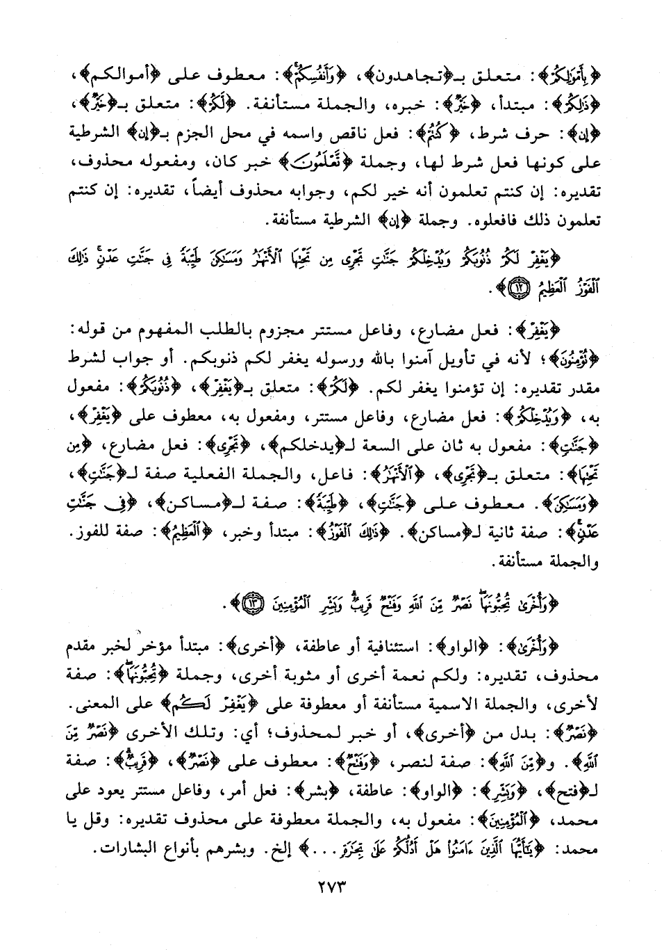 {يَغْفِرْ}: فعل مضارع، وفاعل مستتر مجزوم بالطلب المفهوم من قوله: {تُؤْمِنُونَ}؛ لأنه في تأويل آمنوا بالله ورسوله يغفر لكم ذنوبكم. أو جواب لشرط مقدر تقديره: إن تؤمنوا يغفر لكم. {لَكُمْ}: متعلق بـ {يَغْفِرْ}، {ذُنُوبَكُمْ}: مفعول به، {وَيُدْخِلْكُمْ}: فعل مضارع، وفاعل مستتر، ومفعول به، معطوف على {يَغْفِرْ}، {جَنَّاتٍ}: مفعول به ثان على السعة لـ {يدخلكم}، {تَجْرِي}: فعل مضارع، {مِنْ تَحْتِهَا}: متعلق بـ {تَجْرِي}، {الْأَنْهَارُ}: فاعل، والجملة الفعلية صفة لـ {جَنَّاتِ}، {وَمَسَاكِنَ}. معطوف على {جَنَّاتٍ}، {طَيِّبَةً}: صفة لـ {مساكن}، {فِي جَنَّاتِ عَدْنٍ}: صفة ثانية لـ {مساكن}. {ذَلِكَ الْفَوْزُ}: مبتدأ وخبر، {الْعَظِيمُ}: صفة للفوز. والجملة مستأنفة.