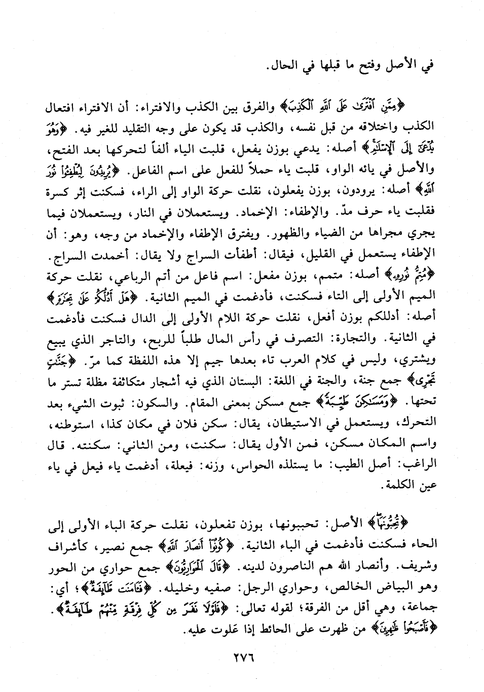 {مِمَّنِ افْتَرَى عَلَى اللَّهِ الْكَذِبَ} والفرق بين الكذب والافتراء: أن الافتراء افتعال الكذب واختلاقه من قبل نفسه، والكذب قد يكون على وجه التقليد للغير فيه. {وَهُوَ يُدْعَى إِلَى الْإِسْلَامِ} أصله: يدعي بوزن يفعل، قلبت الياء ألفًا لتحركها بعد الفتح، والأصل في يائه الواو، قلبت ياء حملًا للفعل على اسم الفاعل. {يُرِيدُونَ لِيُطْفِئُوا نُورَ اللَّهِ} أصله: يرودون، بوزن يفعلون، نقلت حركة الواو إلى الراء، فسمكنت إثر كسرة فقلبت ياء حرف مدّ. والإطفاء: الإخماد. ويستعملان في النار، ويستعملان فيما يجري مجراها من الضياء والظهور. ويفترق الإطفاء والإخماد من وجه، وهو: أن الإطفاء يستعمل في القليل، فيقال: أطفأت السراج ولا يقال: أخمدت السراج. {مُتِمُّ نُورِهِ} أصله: متمم، بوزن مفعل: اسم فاعل من أتم الرباعي، نقلت حركة الميم الأولى إلى التاء فسكنت، فأدغمت في الميم الثانية. {هَلْ أَدُلُّكُمْ عَلَى تِجَارَةٍ}؛ أصله: أدللكم بوزن أفعل، نقلت حركة اللام الأولى إلى الدال فسكنت فأدغمت في الثانية. والتجارة: التصرف في رأس المال طلبًا للربح، والتاجر الذي يبيع ويشتري، وليس في كلام العرب تاء بعدها جيم إلا هذه اللفظة كما مرّ. {جَنَّاتٍ تَجْرِي} جمع جنة، والجنة في اللغة: البستان الذي فيه أشجار متكاثفة مظلة تستر ما تحتها. {وَمَسَاكِنَ طَيِّبَةً} جمع مسكن بمعنى المقام. والسكون: ثبوت الشيء بعد التحرك، ويستعمل في الاستيطان، يقال: سكن فلان في مكان كذا، استوطنه، واسم المكان مسكن، فمن الأول يقال: سكنت، ومن الثاني: سكنته. قال الراغب: أصل الطيب: ما يستلذه الحواس، وزنه: فيعلة، أدغمت ياء فيعل في ياء عين الكلمة.