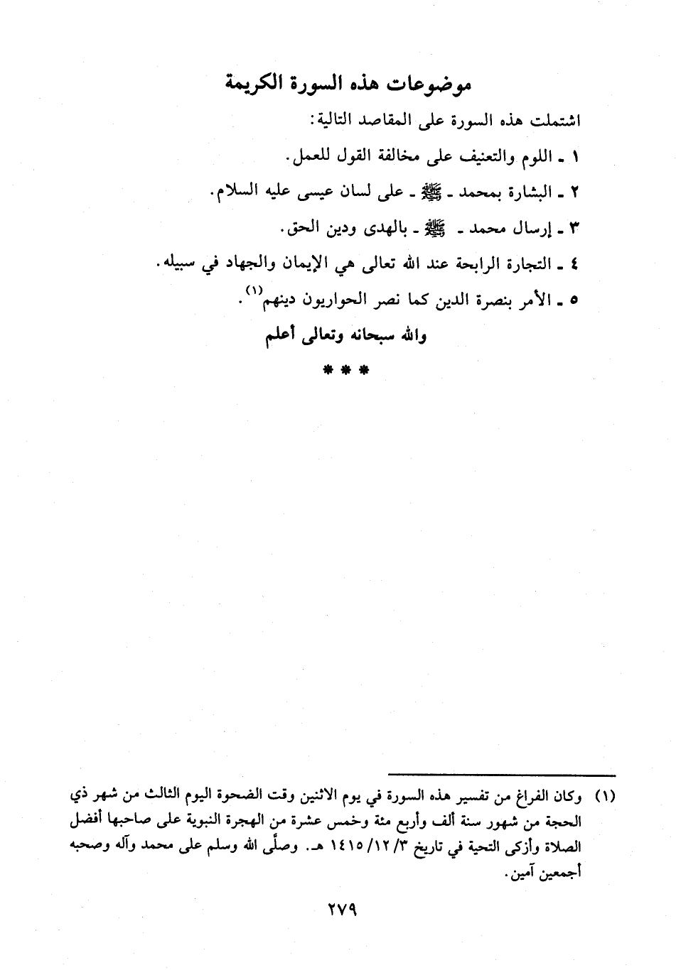 (¬1) وكان الفراغ من تفسير هذه السورة في يوم الاثنين وقت الضحوة اليوم الثالث من شهر ذي الحجة من شهور سنة ألف وأربع مئة وخمس عشرة من الهجرة النبوية على صاحبها أفضل الصلاة وأزكى التحية في تاريخ 3/ 12/ 1415 هـ. وصلى الله وسلم على محمد وآله وصحبه أجمعين آمين.