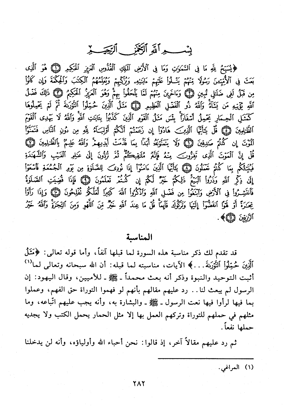 {يُسَبِّحُ لِلَّهِ مَا فِي السَّمَاوَاتِ وَمَا فِي الْأَرْضِ الْمَلِكِ الْقُدُّوسِ الْعَزِيزِ الْحَكِيمِ (1) هُوَ الَّذِي بَعَثَ فِي الْأُمِّيِّينَ رَسُولًا مِنْهُمْ يَتْلُو عَلَيْهِمْ آيَاتِهِ وَيُزَكِّيهِمْ وَيُعَلِّمُهُمُ الْكِتَابَ وَالْحِكْمَةَ وَإِنْ كَانُوا مِنْ قَبْلُ لَفِي ضَلَالٍ مُبِينٍ (2) وَآخَرِينَ مِنْهُمْ لَمَّا يَلْحَقُوا بِهِمْ وَهُوَ الْعَزِيزُ الْحَكِيمُ (3) ذَلِكَ فَضْلُ اللَّهِ يُؤْتِيهِ مَنْ يَشَاءُ وَاللَّهُ ذُو الْفَضْلِ الْعَظِيمِ (4) مَثَلُ الَّذِينَ حُمِّلُوا التَّوْرَاةَ ثُمَّ لَمْ يَحْمِلُوهَا كَمَثَلِ الْحِمَارِ يَحْمِلُ أَسْفَارًا بِئْسَ مَثَلُ الْقَوْمِ الَّذِينَ كَذَّبُوا بِآيَاتِ اللَّهِ وَاللَّهُ لَا يَهْدِي الْقَوْمَ الظَّالِمِينَ (5) قُلْ يَا أَيُّهَا الَّذِينَ هَادُوا إِنْ زَعَمْتُمْ أَنَّكُمْ أَوْلِيَاءُ لِلَّهِ مِنْ دُونِ النَّاسِ فَتَمَنَّوُا الْمَوْتَ إِنْ كُنْتُمْ صَادِقِينَ (6) وَلَا يَتَمَنَّوْنَهُ أَبَدًا بِمَا قَدَّمَتْ أَيْدِيهِمْ وَاللَّهُ عَلِيمٌ بِالظَّالِمِينَ (7) قُلْ إِنَّ الْمَوْتَ الَّذِي تَفِرُّونَ مِنْهُ فَإِنَّهُ مُلَاقِيكُمْ ثُمَّ تُرَدُّونَ إِلَى عَالِمِ الْغَيْبِ وَالشَّهَادَةِ فَيُنَبِّئُكُمْ بِمَا كُنْتُمْ تَعْمَلُونَ (8) يَا أَيُّهَا الَّذِينَ آمَنُوا إِذَا نُودِيَ لِلصَّلَاةِ مِنْ يَوْمِ الْجُمُعَةِ فَاسْعَوْا إِلَى ذِكْرِ اللَّهِ وَذَرُوا الْبَيْعَ ذَلِكُمْ خَيْرٌ لَكُمْ إِنْ كُنْتُمْ تَعْلَمُونَ (9) فَإِذَا قُضِيَتِ الصَّلَاةُ فَانْتَشِرُوا فِي الْأَرْضِ وَابْتَغُوا مِنْ فَضْلِ اللَّهِ وَاذْكُرُوا اللَّهَ كَثِيرًا لَعَلَّكُمْ تُفْلِحُونَ (10) وَإِذَا رَأَوْا تِجَارَةً أَوْ لَهْوًا انْفَضُّوا إِلَيْهَا وَتَرَكُوكَ قَائِمًا قُلْ مَا عِنْدَ اللَّهِ خَيْرٌ مِنَ اللَّهْوِ وَمِنَ التِّجَارَةِ وَاللَّهُ خَيْرُ الرَّازِقِينَ (11)}.