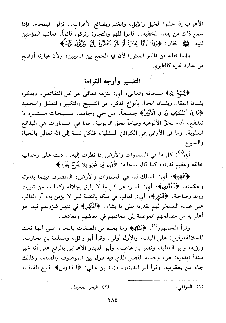 وقرأ الجمهور (¬2): {الْمَلِكِ} وما بعده من الصفات بالجر، على أنها نعت للجلالة، وقيل: على البدل، والأول أولى. وقرأ أبو وائل، ومسلمة بن محارب، ورؤبة، وأبو العالية، ونصر بن عاصم، وأبو الدينار الأعرابي بالرفع على أنه خبر مبتدأ تقديره: هو، وحسنه الفصل الذي فيه طول بين الموصوف والصفة، وكذلك جاء عن يعقوب. وقرأ أبو الدينار، وزيد بن علي: {القدوس} بفتح القاف،
