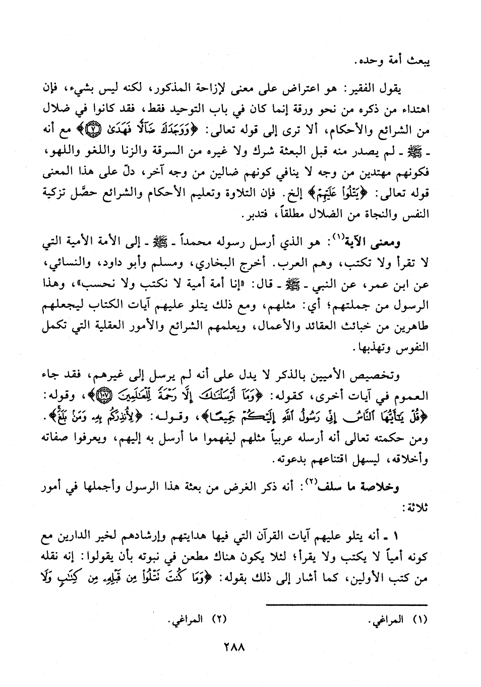 ومعنى الآية (¬1): هو الذي أرسل رسوله محمدًا - صلى الله عليه وسلم - إلى الأمة الأمية التي لا تقرأ ولا تكتب، وهم العرب. أخرج البخاري، ومسلم وأبو داود، والنسائي، عن ابن عمر، عن النبي - صلى الله عليه وسلم - قال: "إنا أمة أمية لا نكتب ولا نحسب"، وهذا الرسول من جملتهم؛ أي: مثلهم، ومع ذلك يتلو عليهم آيات الكتاب ليجعلهم طاهرين من خبائث العقائد والأعمال، ويعلمهم الشرائع والأمور العقلية التي تكمل النفوس وتهذبها.