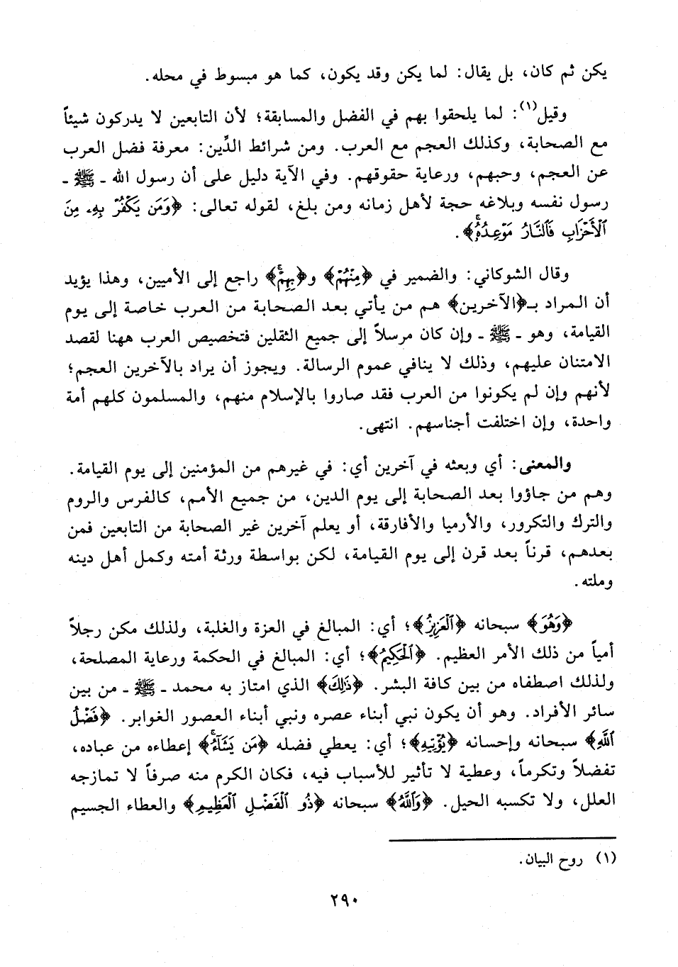 وقال الشوكاني: والضمير في {مِنْهُمْ} و {بِهِمْ} راجع إلى الأميين، وهذا يؤيد أن المراد بـ {الآخرين} هم من يأتي بعد الصحابة من العرب خاصة إلى يوم القيامة، وهو - صلى الله عليه وسلم - وإن كان مرسلًا إلى جميع الثقلين فتخصيص العرب هاهنا لقصد الامتنان عليهم، وذلك لا ينافي عموم الرسالة. ويجوز أن يراد بالآخرين العجم؛ لأنهم وإن لم يكونوا من العرب فقد صاروا بالإِسلام منهم، والمسلمون كلهم أمة واحدة، وإن اختلفت أجناسهم. انتهى.