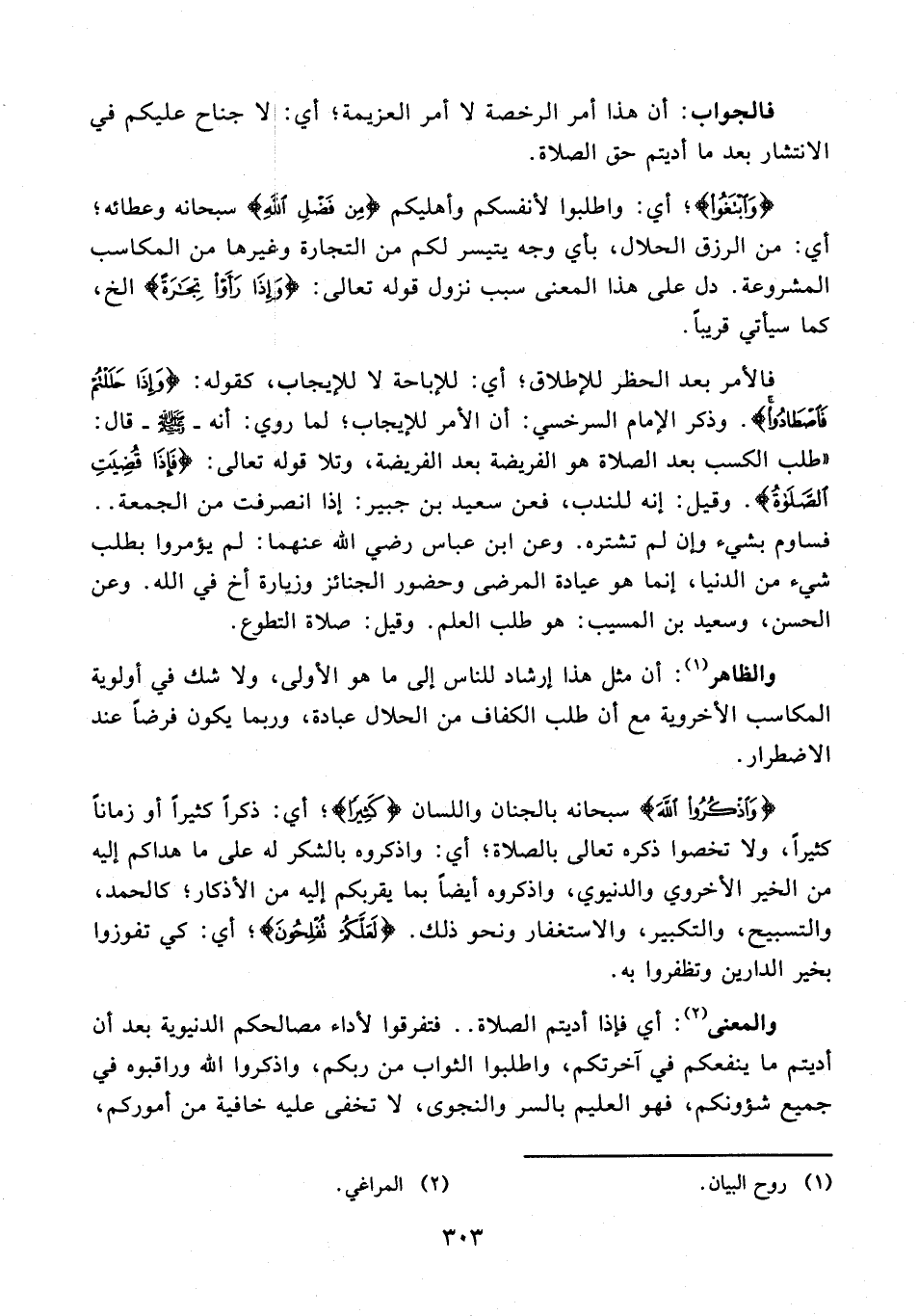 فالأمر بعد الحظر للإطلاق؛ أي: للإباحة لا للإيجاب، كقوله: {وَإِذَا حَلَلْتُمْ فَاصْطَادُوا}. وذكر الإِمام السرخسي: أن الأمر للإيجاب؛ لما روي: أنه - صلى الله عليه وسلم - قال: "طلب الكسب بعد الصلاة هو الفريضة بعد الفريضة، وتلا قوله تعالى: {فَإِذَا قُضِيَتِ الصَّلَاةُ}. وقيل: إنه للندب، فعن سعيد بن جبير: إذا انصرفت من الجمعة .. فساوم بشيء وإن لم تشتره. وعن ابن عباس رضي الله عنهما: لم يؤمروا بطلب شيء من الدنيا، إنما هو عيادة المرضى وحضور الجنائز وزيارة أخ في الله. وعن الحسن، وسعيد بن المسيب: هو طلب العلم. وقيل: صلاة التطوع.