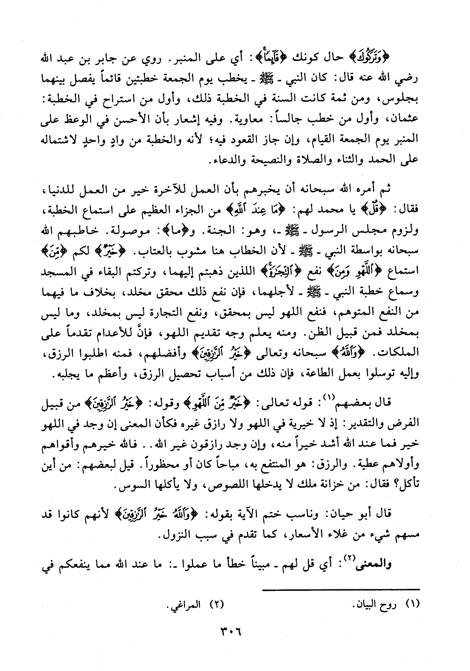 ثم أمره الله سبحانه أن يخبرهم بأن العمل للآخرة خير من العمل للدنيا، فقال: {قُلْ} يا محمد لهم: {مَا عِنْدَ اللَّهِ} من الجزاء العظيم على استماع الخطبة، ولزوم مجلس الرسول - صلى الله عليه وسلم -، وهو: الجنة. و {ما}: موصولة. خاطبهم الله سبحانه بواسطة النبي - صلى الله عليه وسلم - لأن الخطاب هنا مشوب بالعتاب. {خَيْرٌ} لكم {مِنَ} استماع {اللَّهْوِ وَمِنَ} نفع {التِّجَارَةِ} اللذين ذهبتم إليهما، وتركتم البقاء في المسجد وسماع خطبة النبي - صلى الله عليه وسلم - لأجلهما، فإن نفع ذلك محقق مخلد، بخلاف ما فيهما من النفع المتوهم، فنفع اللهو ليس بمحقق، ونفع التجارة ليس بمخلد، وما ليس بمخلد فمن قبيل الظن. ومنه يعلم وجه تقديم اللهو، فإنَّ للأعدام تقدمًا على الملكات. {وَاللَّهُ} سبحانه وتعالى {خَيْرُ الرَّازِقِينَ} وأفضلهم، فمنه اطلبوا الرزق، وإليه توسلوا بعمل الطاعة، فإن ذلك من أسباب تحصيل الرزق، وأعظم ما يجلبه.