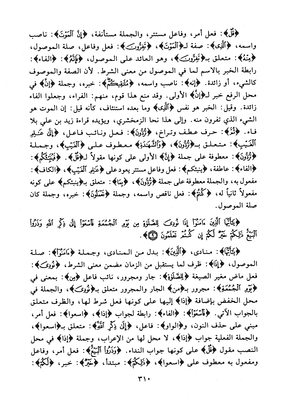 {يَا أَيُّهَا}: منادى، {الَّذِينَ}: بدل من المنادى، وجملة {آمَنُوا}: صلة الموصول، {إِذَا}: ظرف لما يستقبل من الزمان مضمن معنى الشرط، {نُودِيَ}: فعل ماض مغير الصيغة {لِلصَّلَاةِ}: جار ومجرور، نائب فاعل {مِن}: بمعنى في {يَوْمِ الْجُمُعَةِ}: مجرور بـ {من} الجار والمجرور متعلق بـ {نُودِيَ}، والجملة في محل الخفض بإضافة {إذا} إليها على كونها فعل شرط لها، والظرف متعلق بالجواب الآتي. {فَاسْعَوْا}: {الفاء}: رابطة لجواب {إذا}، {اسعوا}: فعل أمر، مبني على حذف النون، و {الواو}: فاعل، {إِلَى ذِكْرِ اللهِ}: متعلق بـ {اسعوا}، والجملة الفعلية جواب {إذا}، لا محل لها من الإعراب، وجملة {إذا} في محل النصب مقول {قُلْ} علي كونها جواب النداء. {وَذَرُوا الْبَيْعَ}: فعل أمر، وفاعل ومفعول به معطوف على {اسعوا}، {ذَلِكُمْ}: مبتدأ، {خَيْرٌ}: خبر، {لَكُمْ}: