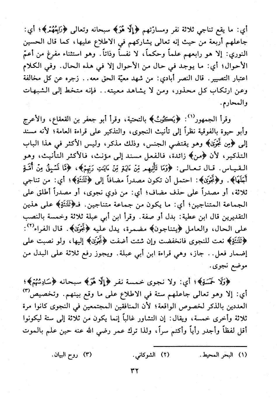 وقرأ الجمهور (¬1): {يَكُونُ} بالتحتية، وقرأ أبو جعفر بن القعقاع، والأعرج وأبو حيوة بالفوقية نظرًا إلى تأنيث النجوى، والتذكير على قراءة العامة؛ لأنه مسند إلى {مِنْ نَجْوَى} وهو يقتضي الجنس، وذلك مذكر، وليس الأكثر في هذا الباب التذكير؛ لأن {من} زائدة، فالفعل مسند إلى مؤنث، فالأكثر التأنيث، وهو القياس. قال تعالى: {مِنْ آيَةٍ مِنْ آيَاتِ رَبِّهِمْ}، {مَا تَسْبِقُ مِنْ أُمَّةٍ أَجَلَهَا وَمَا يَسْتَأْخِرُونَ}. و {نَجْوَى}: احتمل أن تكون مصدرًا مضافًا إلى {ثَلَاثَةٍ}؛ أي: من تناجي ثلاثة، أو مصدرًا على حذف مضاف؛ أي: من ذوي نجوى، أو مصدرًا أطلق على الجماعة المتناجين؛ أي: ما يكون من جماعة متناجين. فـ {ثَلَاثَةٍ} على هذين التقديرين قال ابن عطية: بدل أو صفة. وقرأ ابن أبي عبلة ثلاثة وخمسة بالنصب على الحال، والعامل {يتناجون} مضمرة، يدل عليه {نَجْوَى}. قال الفراء (¬2): {ثَلَاثَةٍ} نعت للنجوى فانخفضت وإن شئت أضفت {نَجْوَى} إليها، ولو نصبت على إضمار فعل .. جاز، وهي قراءة ابن أبي عبلة. ويجوز رفع ثلاثة على البدل من موضع نجوى.