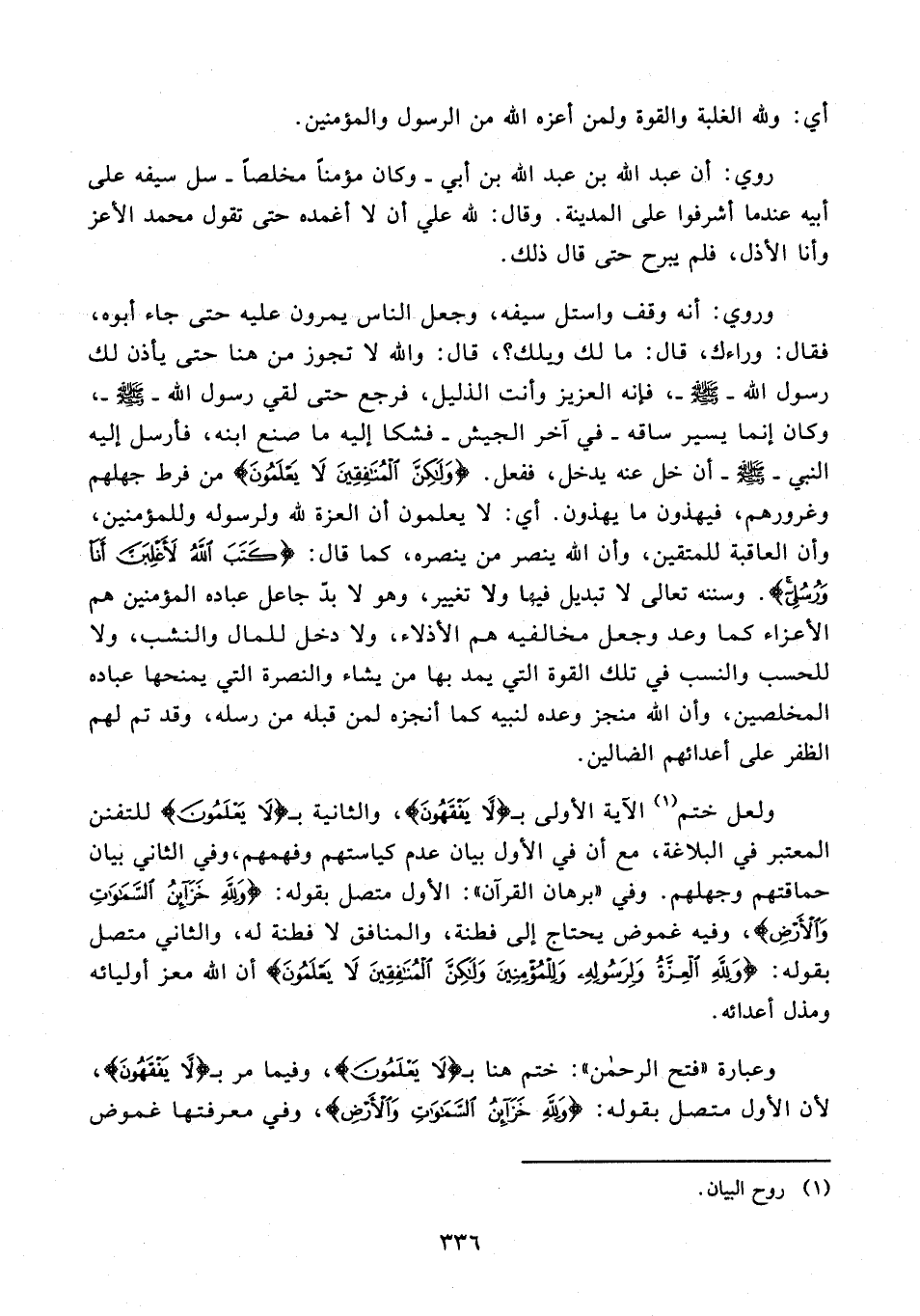 وروي: أنه وقف واستل سيفه، وجعل الناس يقرون عليه حتى جاء أبوه، فقال: وراءك، قال: ما لك ويلك؟، قال: والله لا تجوز من هنا حتى يأذن لك رسول الله - صلى الله عليه وسلم -، فإنه العزيز وأنت الذليل، فرجع حتى لقي رسول الله - صلى الله عليه وسلم -، وكان إنما يسير ساقه - في آخر الجيش - فشكا إليه ما صنع ابنه، فأرسل إليه النبي - صلى الله عليه وسلم - أن خل عنه يدخل، ففعل. {وَلَكِنَّ الْمُنَافِقِينَ لَا يَعْلَمُونَ} من فرط جهلهم وغرورهم، فيهذون ما يهذون. أي: لا يعلمون أن العزة لله ولرسوله وللمؤمنين، وأن العاقبة للمتقين، وأن الله ينصر من ينصره، كما قال: {كَتَبَ اللَّهُ لَأَغْلِبَنَّ أَنَا وَرُسُلِي}. وسننه تعالى لا تبديل فيها ولا تغيير، وهو لا بدّ جاعل عباده المؤمنين هم الأعزاء كما وعد وجعل مخالفيه هم الأذلاء، ولا دخل للمال والنشب، ولا للحسب والنسب في تلك القوة التي يمد بها من يشاء والنصرة التي يمنحها عباده المخلصين، وأن الله منجز وعده لنبيه كما أنجزه لمن قبله من رسله، وقد تم لهم الظفر على أعدائهم الضالين.