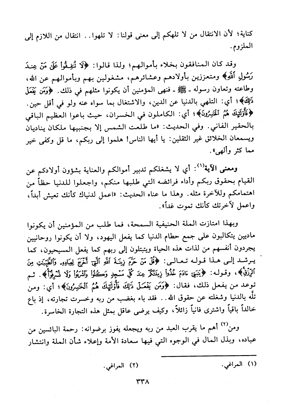 ومعنى الآية (¬1): أي لا يشغلكم تدبير أموالكم والعناية بشؤون أولادكم عن القيام بحقوق ربكم وأداء فرائضه التي طلبها منكم، واجعلوا للدنيا حظًا من اهتمامكم وللآخرة مثله. وهذا ما عناه الحديث: "اعمل لدنياك كأنك تعيش أبدًا، واعمل لآخرتك كأنك تموت غدًا".