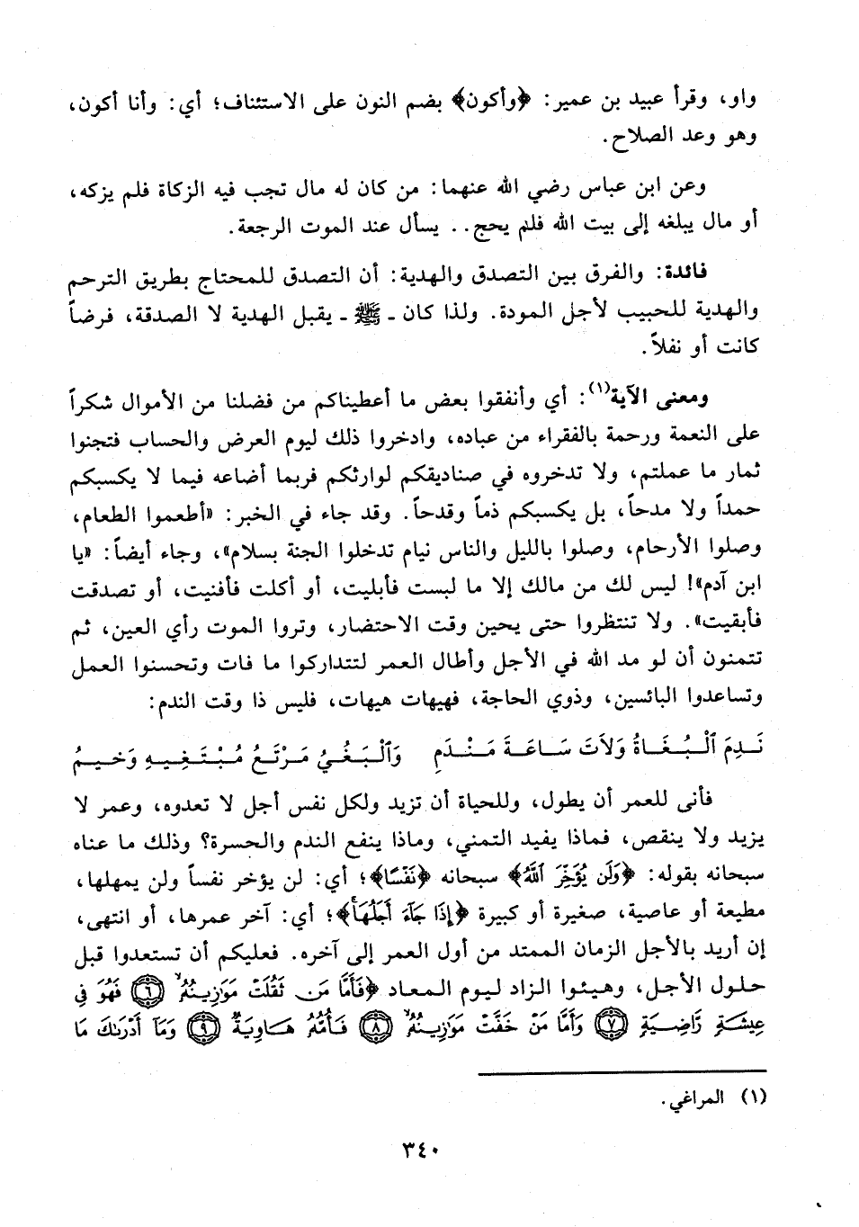 ومعنى الآية (¬1): أي وأنفقوا بعض ما أعطيناكم من فضلنا من الأموال شكرًا على النعمة ورحمة بالققراء من عباده، وادخروا ذلك ليوم العرض والحساب فتجنوا ثمار ما عملتم، ولا تدخروه في صناديقكم لوارثكم فربما أضاعه فيما لا يكسبكم حمدًا ولا مدحًا، بل يكسبكم ذمًا وقدحًا. وقد جاء في الخبر: "أطعموا الطعام، وصلوا الأرحام، وصلوا بالليل والناس نيام تدخلوا الجنة بسلام"، وجاء أيضًا: "يا ابن آدم"! ليس لك من مالك إلا ما لبست فأبليت، أو أكلت فأفنيت، أو تصدقت فأبقيت". ولا تنتظروا حتى يحين وقت الاحتضار، وتروا الموت رأي العين، ثم تتمنون أن لو مد الله في الأجل وأطال العمر لتتداركوا ما فات وتحسنوا العمل وتساعدوا البائسين، وذوي الحاجة، فهيهات هيهات، فليس ذا وقت الندم: