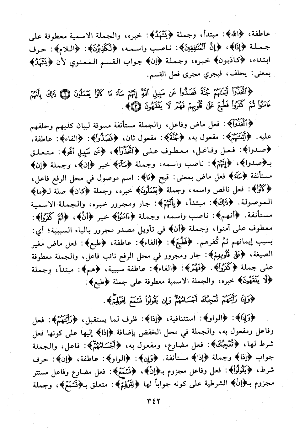 {اتَّخَذُوا}: فعل ماض وفاعل، والجملة مستأنفة مسوقة لبيان كذبهم وحلفهم عليه. {أَيْمَانَهُمْ}: مفعول به، {جُنَّةً}: مفعول ثان، {فَصَدُّوا}: {الفاء}: عاطفة، {صدوا}: فعل وفاعل، معطوف على {اتَّخَذُوا}، {عَنْ سَبِيلِ اللَّهِ}: متعلق بـ {صدوا}، {إِنَّهُمْ}: ناصب واسمه، وجملة {سَاءَ} خبر {إن}، وجملة {إن} مستأنفة {سَاءَ} فعل ماض بمعنى: قبح {مَا}: اسم موصول في محل الرفع فاعل، {كَانُوا}: فعل ناقص واسمه، وجملة {يَعْمَلُونَ} خبره، وجملة {كان} صلة لـ {ما} الموصولة. {ذَلِكَ}: مبتدأ، {بِأَنَّهُمْ}: جار ومجرور خبره، والجملة الاسمية مستأنفة. {أنهم}: ناصب واسمه، وجملة {آمَنُوا} خبر {أنَّ}، {ثُمَّ كَفَرُوا}: معطوف على آمنوا، وجملة {أن} في تأويل مصدر مجرور بالباء السببية؛ أي: بسبب إيمانهم ثمَّ كُفرهم. {فَطُبِعَ}: {الفاء}: عاطفة، {طبع}: فعل ماض مغير الصيغة، {عَلَى قُلُوبِهِمْ}: جار ومجرور في محل الرفع نائب فاعل، والجملة معطوفة على جملة {كَفَرُوا}. {فَهُمْ}: {الفاء}: عاطفة سببية، {هم}: مبتدأ، وجملة {لَا يَفْقَهُونَ} خبره، والجملة الاسمية معطوفة على جملة {طبع}.