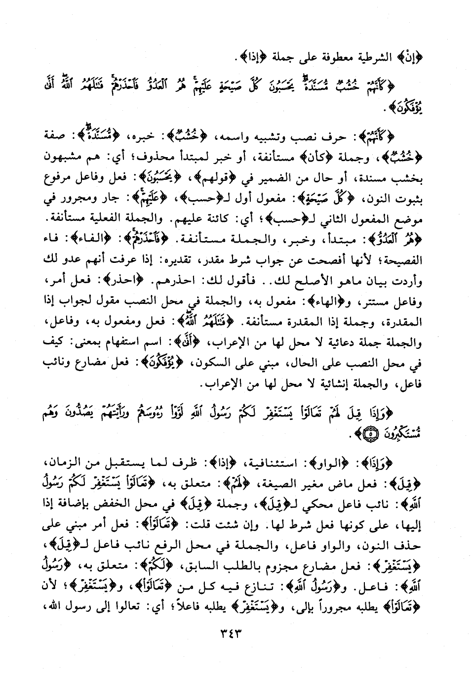 {كَأَنَّهُمْ}: حرف نصب وتشبيه واسمه، {خُشُبٌ}: خبره، {مُسَنَّدَةٌ}: صفة {خُشُبٌ}، وجملة {كَأَنَّ} مستأنفة، أو خبر لمبتدأ محذوف؛ أي: هم مشبهون بخشب مسندة، أو حال من الضمير في {قولهم}، {يَحْسَبُونَ}: فعل وفاعل مرفوع بثبوت النون، {كُلَّ صَيْحَةٍ}: مفعول أول لـ {حسب}، {عَلَيْهِمْ}: جار ومجرور في موضع المفعول الثاني لـ {حسب}؛ أي: كائنة عليهم. والجملة الفعلية مستأنفة. {هُمُ الْعَدُوُّ}: مبتدأ، وخبر، والجملة مستأنفة. {فَاحْذَرْهُمْ}: {الفاء}: فاء الفصيحة؛ لأنها أفصحت عن جواب شرط مقدر، تقديره: إذا عرفت أنهم عدو لك وأردت بيان ما هو الأصلح لك .. فأقول لك: احذرهم. {احذر}: فعل أمر، وفاعل مستتر، و {الهاء}: مفعول به، والجملة في محل النصب مقول لجواب إذا المقدرة، وجملة إذا المقدرة مستأنفة. {قَاتَلَهُمُ اللَّهُ}: فعل ومفعول به، وفاعل، والجملة جملة دعائية لا محل لها من الإعراب، {أَنَّى}: اسم استفهام بمعنى: كيف في محل النصب على الحال، مبني على السكون، {يُؤْفَكُونَ}: فعل مضارع ونائب فاعل، والجملة إنشائية لا محل لها من الإعراب.