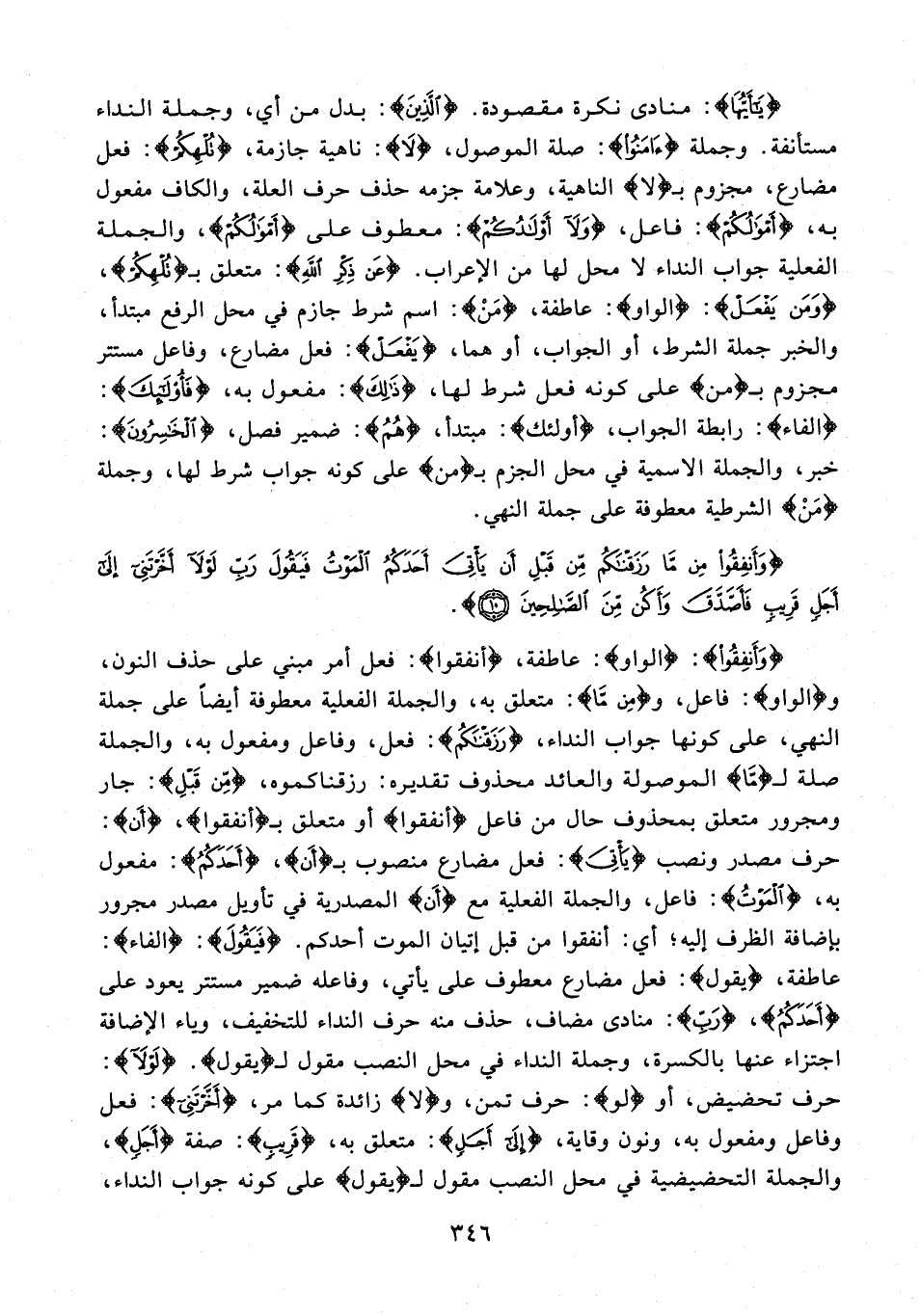 {وَأَنْفِقُوا}: {الواو}: عاطفة، {أَنْفِقُوا}: فعل أمر مبني على حذف النون، و {الواو}: فاعل، و {مِنْ مَا}: متعلق به، والجملة الفعلية معطوفة أيضًا على جملة النهي، على كونها جواب النداء، {رَزَقْنَاكُمْ}: فعل، وفاعل ومفعول به، والجملة صلة لـ {مَا} الموصولة والعائد محذوف تقديره: رزقناكموه، {مِنْ قَبْلِ}: جار ومجرور متعلق بمحذوف حال من فاعل {أنفقوا} أو متعلق بـ {أنفقوا}، {أَن}: حرف مصدر ونصب {يَأْتِيَ}: فعل مضارع منصوب بـ {أنَ}، {أَحَدَكُمُ}: مفعول به، {الْمَوْتُ}: فاعل، والجملة الفعلية مع {أَن} المصدرية في تأويل مصدر مجرور بإضافة الظرف إليه؛ أي: أنفقوا من قبل إتيان الموت أحدكم. {فَيَقُولَ}: {الفاء}: عاطفة، {يقول}: فعل مضارع معطوف على يأتي، وفاعله ضمير مستتر يعود على {أَحَدَكُمُ}، {رَبِّ}: منادى مضاف، حذف منه حرف النداء للتخفيف، وياء الإضافة اجتزاء عنها بالكسرة، وجملة النداء في محل النصب مقول لـ {يقول}. {لَوْلَا}: حرف تحضيض، أو {لو}: حرف تمن، و {لا} زائدة كما مر، {أَخَّرْتَنِي}: فعل وفاعل ومفعول به، ونون وقاية، {إِلَى أَجَلٍ}: متعلق به، {قَرِيبٍ}: صفة {أَجَلٍ}، والجملة التحضيضية في محل النصب مقول لـ {يقول} على كونه جواب النداء،