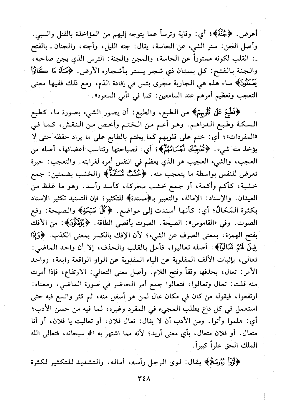 {فَطُبِعَ عَلَى قُلُوبِهِمْ} من الطبع، والطبع: أن يصور الشيء بصورة ما، كطبع السكة وطبع الدراهم. وهو أعم من الختم وأخص من النقش، كما في "المفردات"؛ أي: ختم على قلوبهم كما يختم بالطابع على ما يراد حفظه حتى لا يؤخذ منه شيء. {تُعْجِبُكَ أَجْسَامُهُمْ}؛ أي: لصباحتها وتناسب أعضائها، أصله من العجب، والشيء العجيب هو الذي يعظم في النفس أمره لغرابته. والتعجب: حيرة تعرض للنفس بواسطة ما يتعجب منه. {خُشُبٌ مُسَنَّدَةٌ} والخشب بضمتين: جمع خشبة، كأكم وأكمة، أو جمع خشب محركة، كأسد وأسد. وهو ما غلظ من العيدان. والإسناد: الإمالة، والتعبير بـ {مسندة} للتكثير؛ فإن التسنيد تكثير الإسناد بكثرة المَحَالِّ؛ أي: كأنها أسندت إلى مواضع. {كُلَّ صَيْحَةٍ} والصيحة: رفع الصوت. وفي "القاموس": الصيحة. الصوت بأقصى الطاقة. {يُؤْفَكُونَ}: من الأفك بفتج الهمزة، بمعنى الصرف عن الشيء؛ لأن الإفك بالكسر بمعنى الكذب. {وَإِذَا قِيلَ لَهُمْ تَعَالَوْا}: أصله تعاليوا، فأعل بالقلب والحذف، إلا أن واحد الماضي: تعالى، بإثبات الألف المقلوبة عن الياء المقلوبة عن الواو الواقعة رابعة، وواحد الأمر: تعال، بحذفها وقفًا وفتح اللام. وأصل معنى التعالي: الارتفاع، فإذا أمرت منه قلت: تعال وتعالوا، فتعالوا جمع أمر الحاضر في صورة الماضي، ومعناه: ارتفعوا، فيقوله من كان في مكان عال لمن هو أسفل منه، ثم كثر واتسع فيه حتى استعمل في كل داع يطلب المجيء في المفرد وغيره، لما فيه من حسن الأدب؛ أي: هلموا وأتوا. ومن الأدب أن لا يقال: تعال فلان، أو تعاليت يا فلان، أو أنا متعال، أو فلان متعال، بأي معنى أريد؛ لأنه مما اشتهر به الله سبحانه، فتعالى الله الملك الحق علوًا كبيرًا.