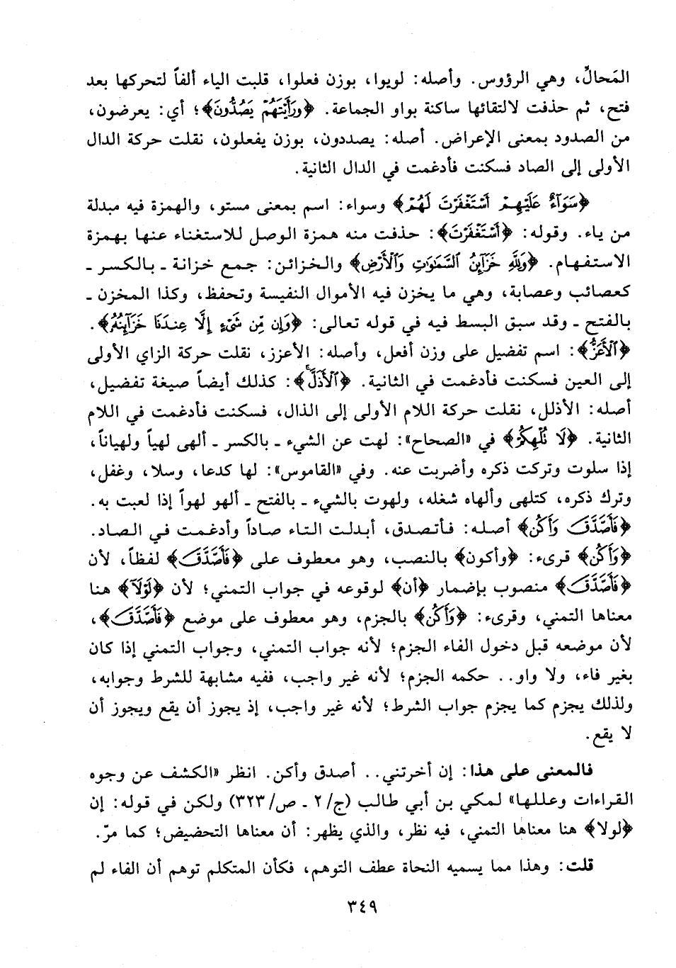 {سَوَاءٌ عَلَيْهِمْ أَسْتَغْفَرْتَ لَهُمْ} وسواء: اسم بمعنى مستو، والهمزة فيه مبدلة من ياء. وقوله: {أَسْتَغْفَرْتَ}: حذفت منه همزة الوصل للاستغناء عنها بهمزة الاستفهام. {وَلِلَّهِ خَزَائِنُ السَّمَاوَاتِ وَالْأَرْضِ} والخزائن: جمع خزانة - بالكسر - كعصائب وعصابة، وهي ما يخزن فيه الأموال النفيسة وتحفظ، وكذا المخزن - بالفتح - وقد سبق البسط فيه في قوله تعالى: {وَإِنْ مِنْ شَيْءٍ إِلَّا عِنْدَنَا خَزَائِنُهُ}. {الْأَعَزُّ}: اسم تفضيل على وزن أفعل، وأصله: الأعزز، نقلت حركة الزاي الأولى إلى العين فسكنت فأدغمت في الثانية. {الْأَذَلَّ}: كذلك أيضًا صيغة تفضيل، أصله: الأذلل، نقلت حركة اللام الأولى إلى الذال، فسكنت فأدغمت في اللام الثانية. {لَا تُلْهِكُمْ} في "الصحاح": لهت عن الشيء - بالكسر - ألهى لهيًا ولهيانًا، إذا سلوت وتركت ذكره وأضربت عنه. وفي "القاموس": لها كدعا، وسلا، وغفل، وترك ذكره، كتلهى وألهاه شغله، ولهوت بالشيء - بالفتح - ألهو لهوًا إذا لعبت به. {فَأَصَّدَّقَ وَأَكُنْ} أصله: فأتصدق، أبدلت التاء صادًا وأدغمت في الصاد. {وَأَكُنْ} قرىء: {وأكون} بالنصب، وهو معطوف على {فَأَصَّدَّقَ} لفظًا؛ لأن {فَأَصَّدَّقَ} منصوب بإضمار {أن} لوقوعه في جواب التمني؛ لأن {لَوْلَا} هنا معناها التمني، وقرىء: {وَأَكُنْ} بالجزم، وهو معطوف على موضع {فَأَصَّدَّقَ}، لأن موضعه قبل دخول الفاء الجزم؛ لأنه جواب التمني، وجواب التمني إذا كان بغير فاء، ولا واو .. حكمه الجزم؛ لأنه غير واجب، ففيه مشابهة للشرط وجوابه، ولذلك يجزم كما يجزم جواب الشرط؛ لأنه غير واجب، إذ يجوز أن يقع ويجوز أن لا يقع.