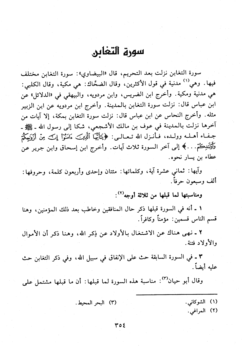 سورة التغابن نزلت بعد التحريم، قال "البيضاوي": سورة التغابن اختلف فيها. وهي (¬1) مدنية في قول الأكثرين، وقال الضحَّاك: هي مكية، وقال الكلبي: هي مدنية ومكية. وأخرج ابن الضريس، وابن مردويه، والبيهقي في "الدلائل" عن ابن عباس قال: نزلت سورة التغابن بالمدينة. وأخرج ابن مردويه عن ابن الزبير مثله. وأخرج النحاس عن ابن عباس قال: نزلت سورة التغابن بمكة، إلا آيات من آخرها نزلت بالمدينة في عوف بن مالك الأشجعي، شكا إلى رسول الله - صلى الله عليه وسلم - جفاء أهله وولده، نانزل الله تعالى: {يَا أَيُّهَا الَّذِينَ آمَنُوا إِنَّ مِنْ أَزْوَاجِكُمْ وَأَوْلَادِكُمْ ...} إلى آخر السورة ثلاث آيات. وأخرج ابن إسحاق وابن جرير عن عطاء بن يسار نحوه.