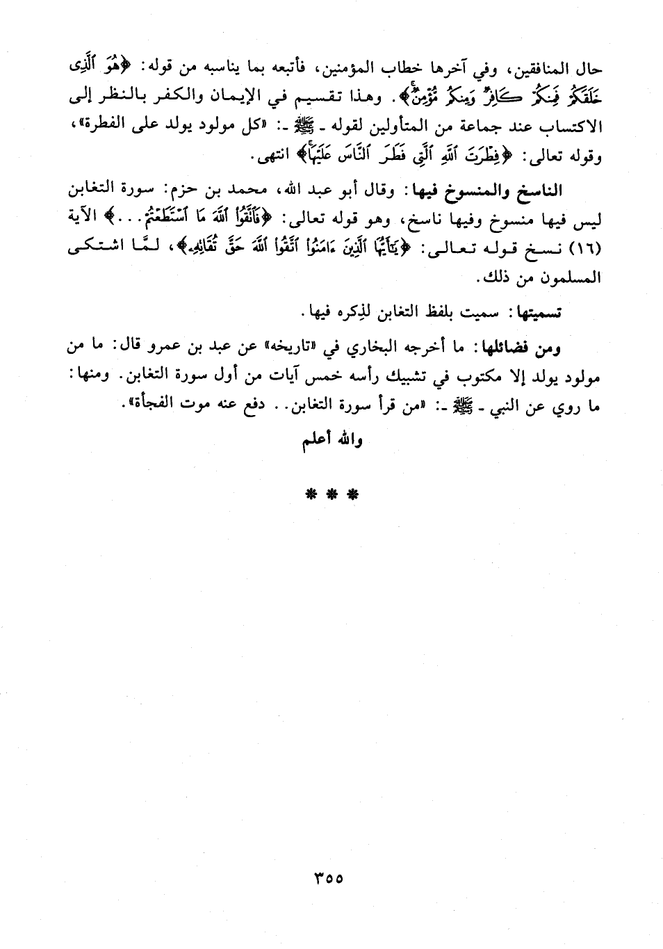 ومن فضائلها: ما أخرجه البخاري في "تاريخه" عن عبد بن عمرو قال: ما من مولود يولد إلا مكتوب في تشبيك رأسه خمس آيات من أول سورة التغابن. ومنها: ما روي عن النبي - صلى الله عليه وسلم -: "من قرأ سورة التغابن .. دفع عنه موت الفجأة".