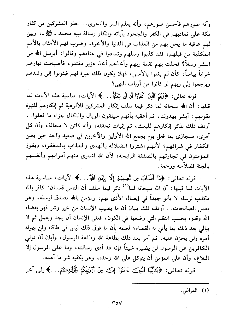 قوله تعالى: {مَا أَصَابَ مِنْ مُصِيبَةٍ إِلَّا بِإِذْنِ اللَّهِ ...} الآيات، مناسبة هذه الآيات لما قبلها: أن الله سبحانه لما (¬1) ذكر فيما سلف أن الناس قسمان: كافر بالله مكذب لرسله لا يألو جهدًا في إيصال الأذى بهم، ومؤمن بالله مصدق لرسله، وهو يعمل الصالحات .. أردف ذلك ببيان أن ما يصيب الإنسان من خير وشر فهو بقضاء الله وقدره بحسب النظم التي وضعها في الكون، فعلى الإنسان أن يجد ويعمل ثم لا يبالي بعد ذلك بما يأتي به القضاء؛ لعلمه بأن ما فوق ذلك ليس في طاقته ولو يهوله أمره ولن يحزن عليه. ثم أمر بعد ذلك بطاعة الله وطاعة الرسول، وأبان أن تولي الكافرين عن الرسول لن يضيره شيئًا فإنه قد أدى رسالته، وما على الرسول إلا البلاغ، وأن على المؤمن أن يتوكل على الله وحده، وهو يكفيه شر ما أهمه.