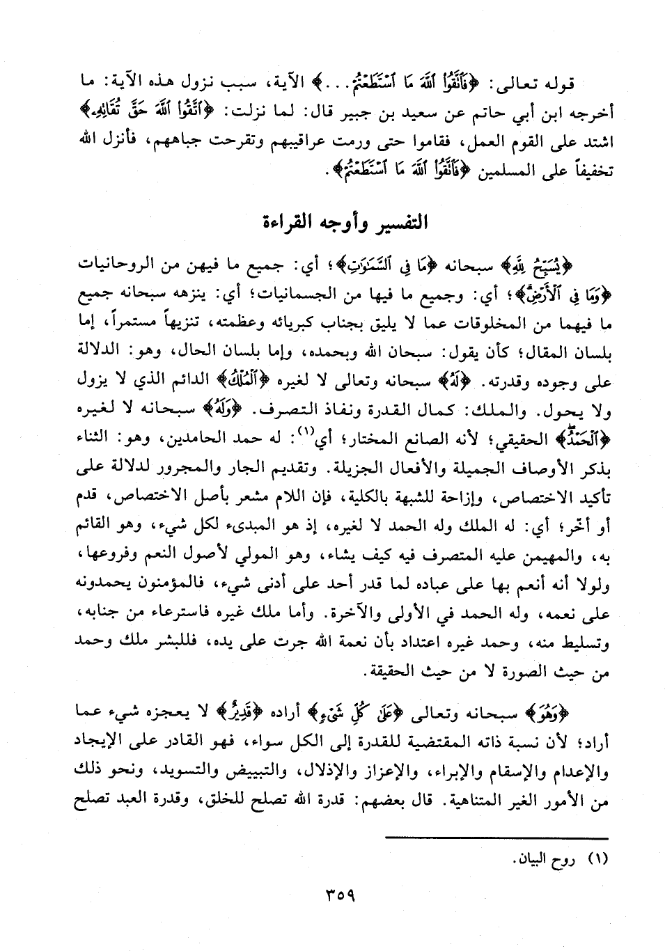 1 - {يُسَبِّحُ لِلَّهِ} سبحانه {مَا فِي السَّمَاوَاتِ} أي: جميع ما فيهن من الروحانيات {وَمَا فِي الْأَرْضِ}؛ أي: وجميع ما فيها من الجسمانيات؛ أي: ينزهه سبحانه جميع ما فيهما من المخلوقات عما لا يليق بجناب كبريائه وعظمته، تنزيهًا مستمرًا، إما بلسان المقال؛ كأن يقبل: سبحان الله وبحمده، وإما بلسان الحال، وهو: الدلالة على وجوده وقدرته. {لَهُ} سبحانه وتعالى لا لغيره {الْمُلْكُ} الدائم الذي لا يزول ولا يحول. والملك: كمال القدرة ونفاذ التصرف. {وَلَهُ} سبحانه لا لغيره {الْحَمْدُ} الحقيقي؛ لأنه الصانع المختار؛ أي (¬1): له حمد الحامدين، وهو: الثناء بذكر الأوصاف الجميلة والأفعال الجزيلة. وتقديم الجار والمجرور لدلالة على تأكيد الاختصاص، وازاحة للشبهة بالكلية، فإن اللام مشعر بأصل الاختصاص، قدم أو أخّر؛ أي: له الملك وله الحمد لا لغيره، إذ هو المبدىء لكل شيء، وهو القائم به، والمهيمن عليه المتصرف فيه كيف يشاء، وهو المولي لأصول النعم وفروعها، ولولا أنه أنعم بها على عباده لما قدر أحد على أدنى شيء، فالمؤمنون يحمدونه على نعمه، وله الحمد في الأولى والآخرة. وأما ملك غيره فاسترعاء من جنابه، وتسليط منه، وحمد غيره اعتداد بأن نعمة الله جرت على يده، فللبشر ملك وحمد من حيث الصورة لا من حيث الحقيقة.